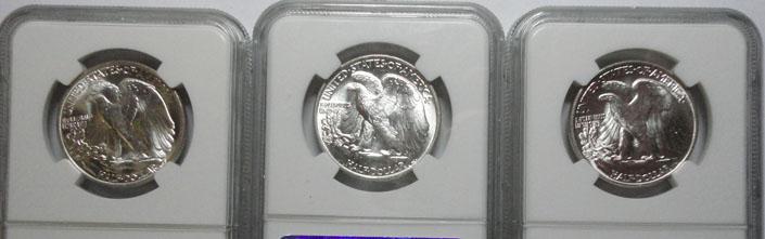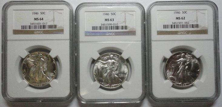 1946 Walker half $ NGC62-63-64--3 coins
