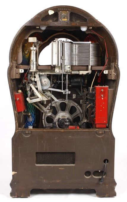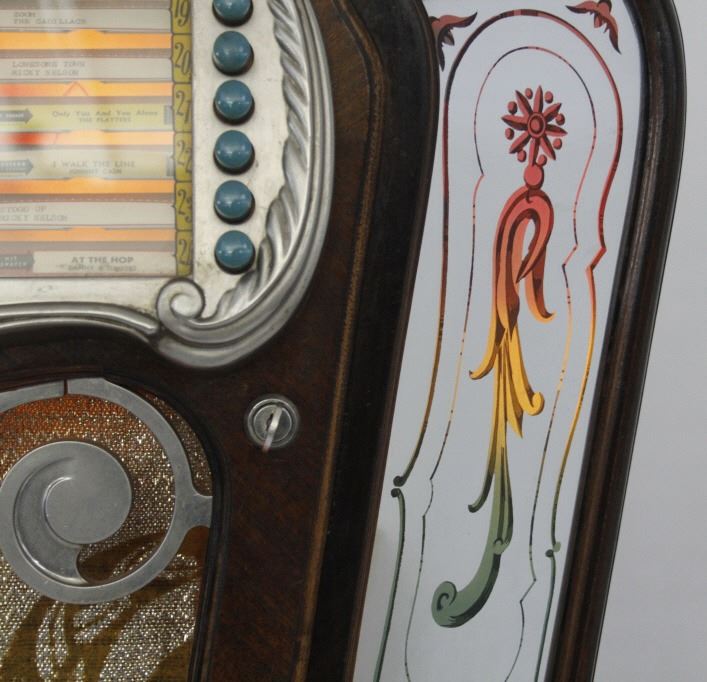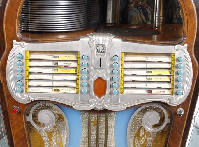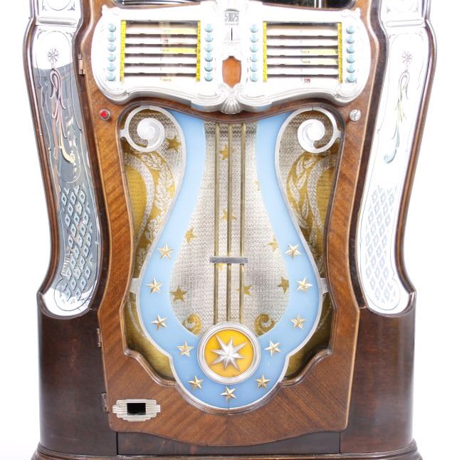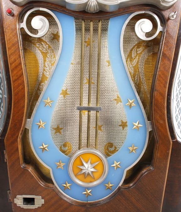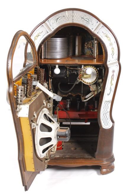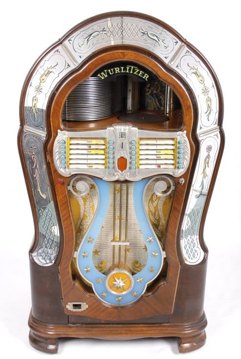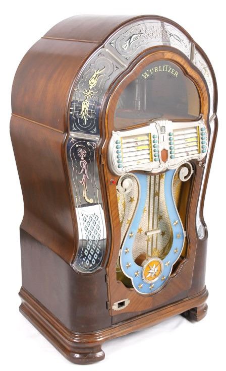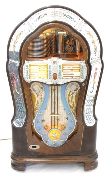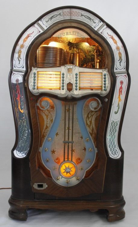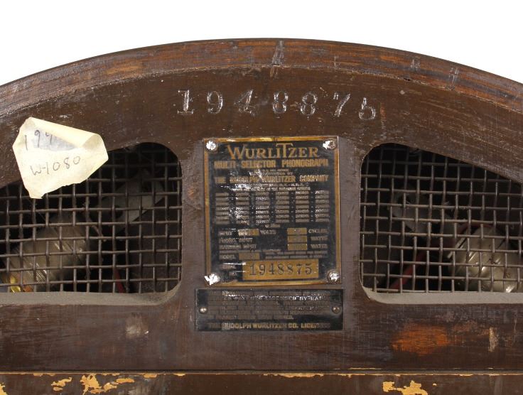 This is a rare1946 Wurlitzer 1080 "Colonial" or "Mae West" fully functioning jukebox. The cabinet shows a combination of California redwood and complimentary woods. The front shows a figural antique lyre style grill with mirrored plastic accent panels. The coin entry slots are illuminated and the jukebox offers 24 selections. The arched glass panel is marked "Wurlitzer" through which the phonograph can be seen. The Wurlitzer jukebox is in very good condition. It is in complete working condition with lights and sound. The phonograph is mechanically sound as well. The juke box measures 33" W x 24" D x 58" T. Serial number is 1948875.