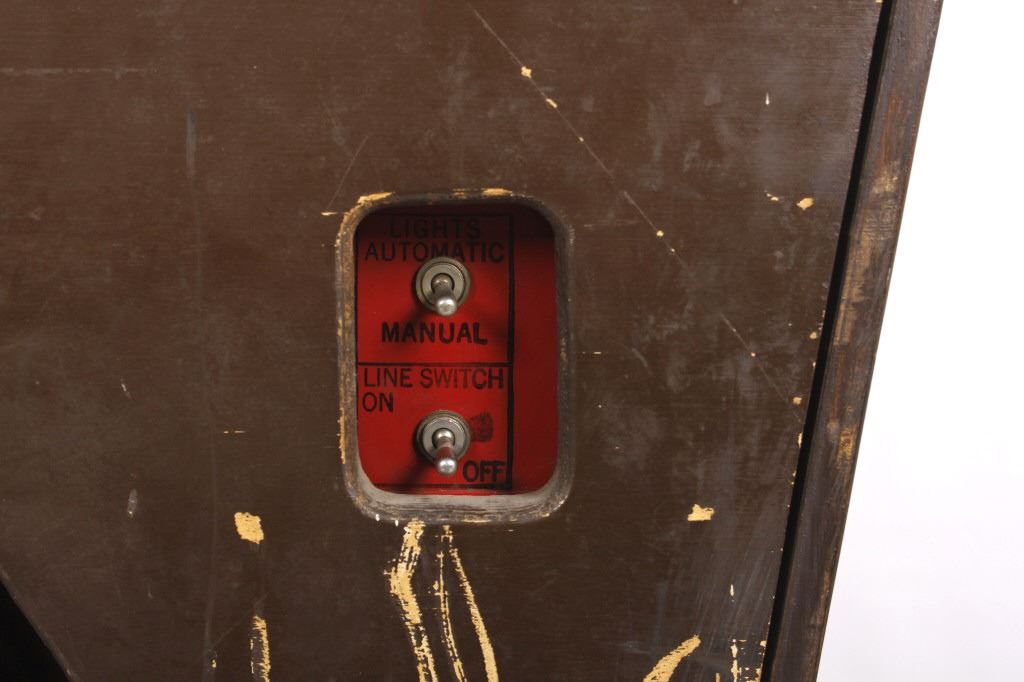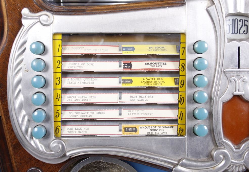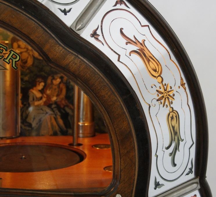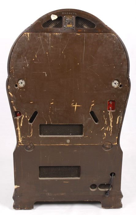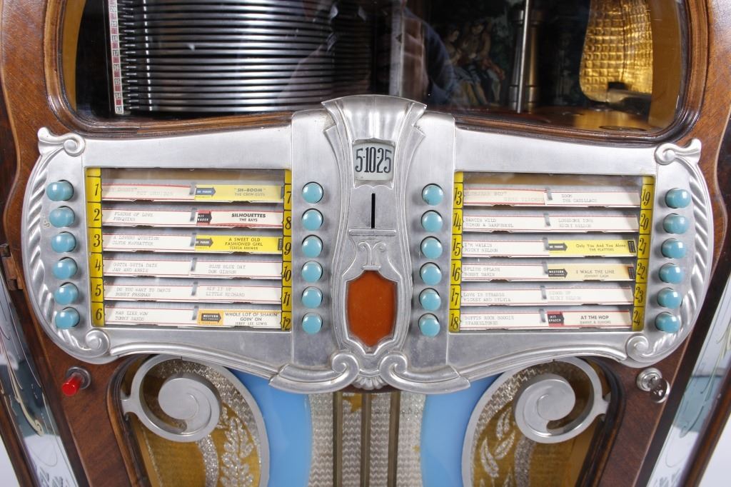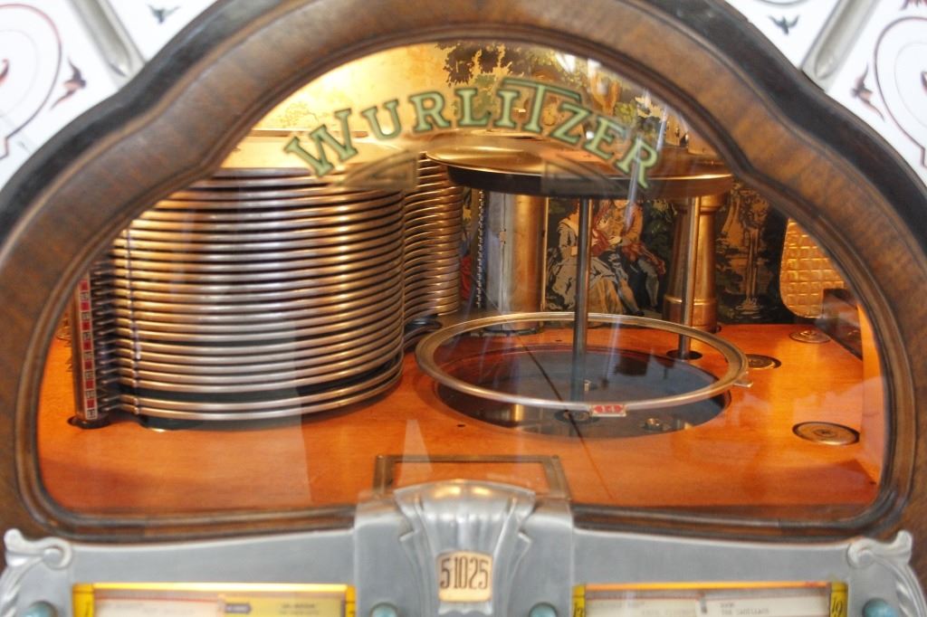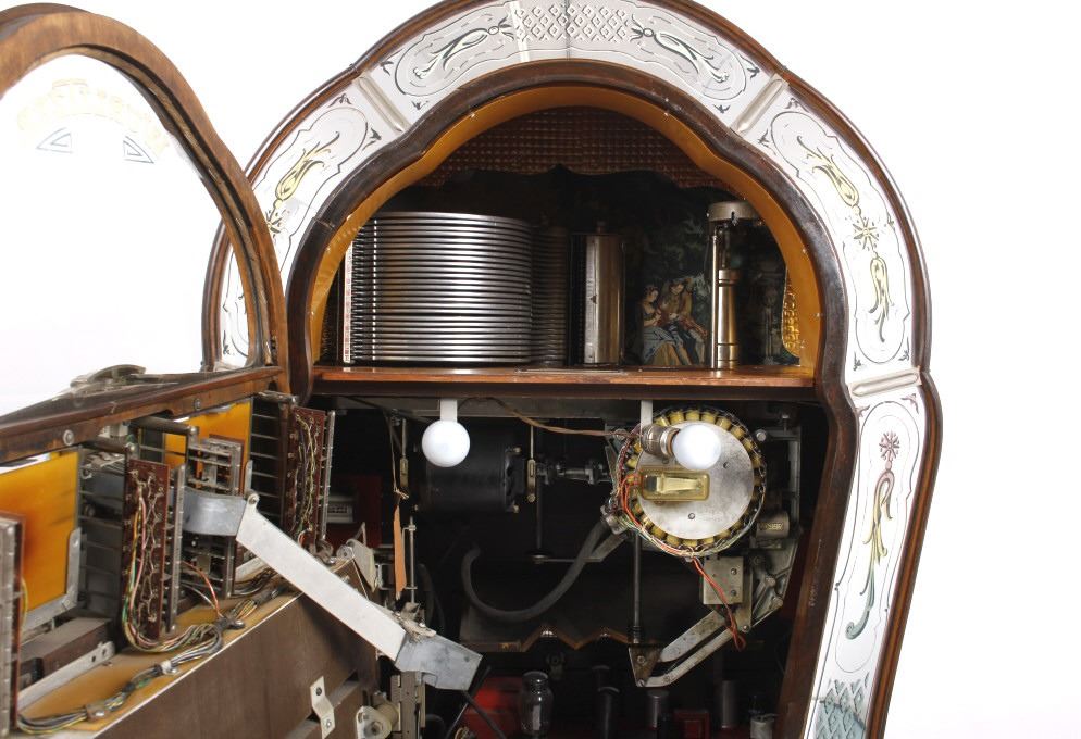 This is a rare1946 Wurlitzer 1080 "Colonial" or "Mae West" fully functioning jukebox. The cabinet shows a combination of California redwood and complimentary woods. The front shows a figural antique lyre style grill with mirrored plastic accent panels. The coin entry slots are illuminated and the jukebox offers 24 selections. The arched glass panel is marked "Wurlitzer" through which the phonograph can be seen. The Wurlitzer jukebox is in very good condition. It is in complete working condition with lights and sound. The phonograph is mechanically sound as well. The juke box measures 33" W x 24" D x 58" T. Serial number is 1948875.