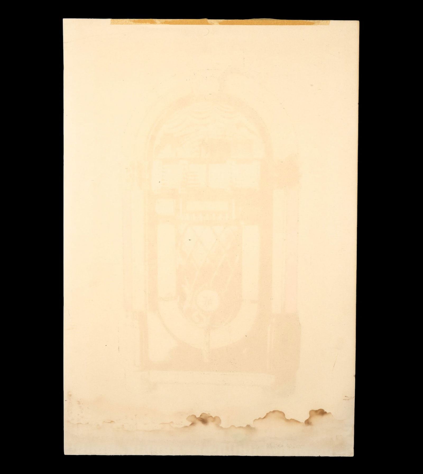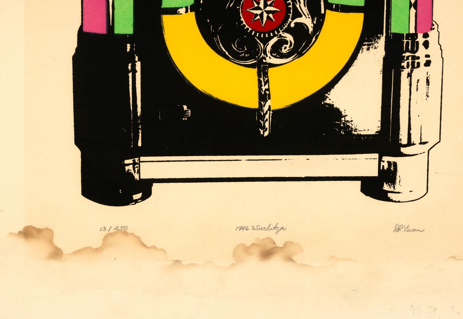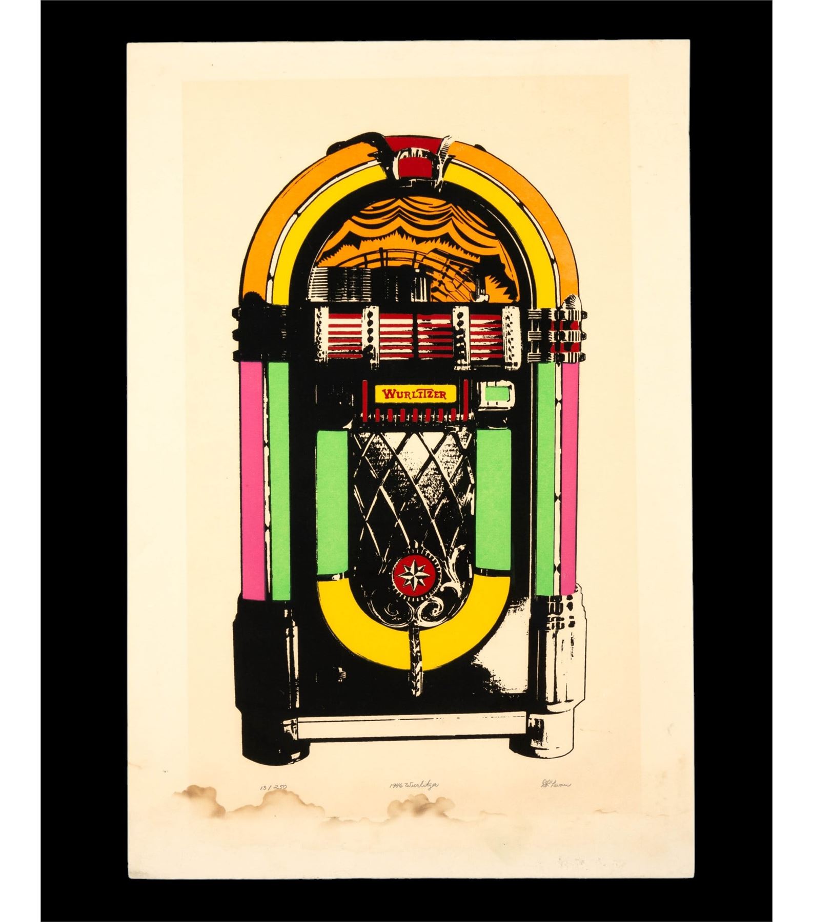 6 color silkscreen titled "1946 Wurlitzer" - signed and number "DL Levan" LR - 13/250 LL on 17.5" W x 26" H cream printmaking paper with some wear and discoloration at the bottom.