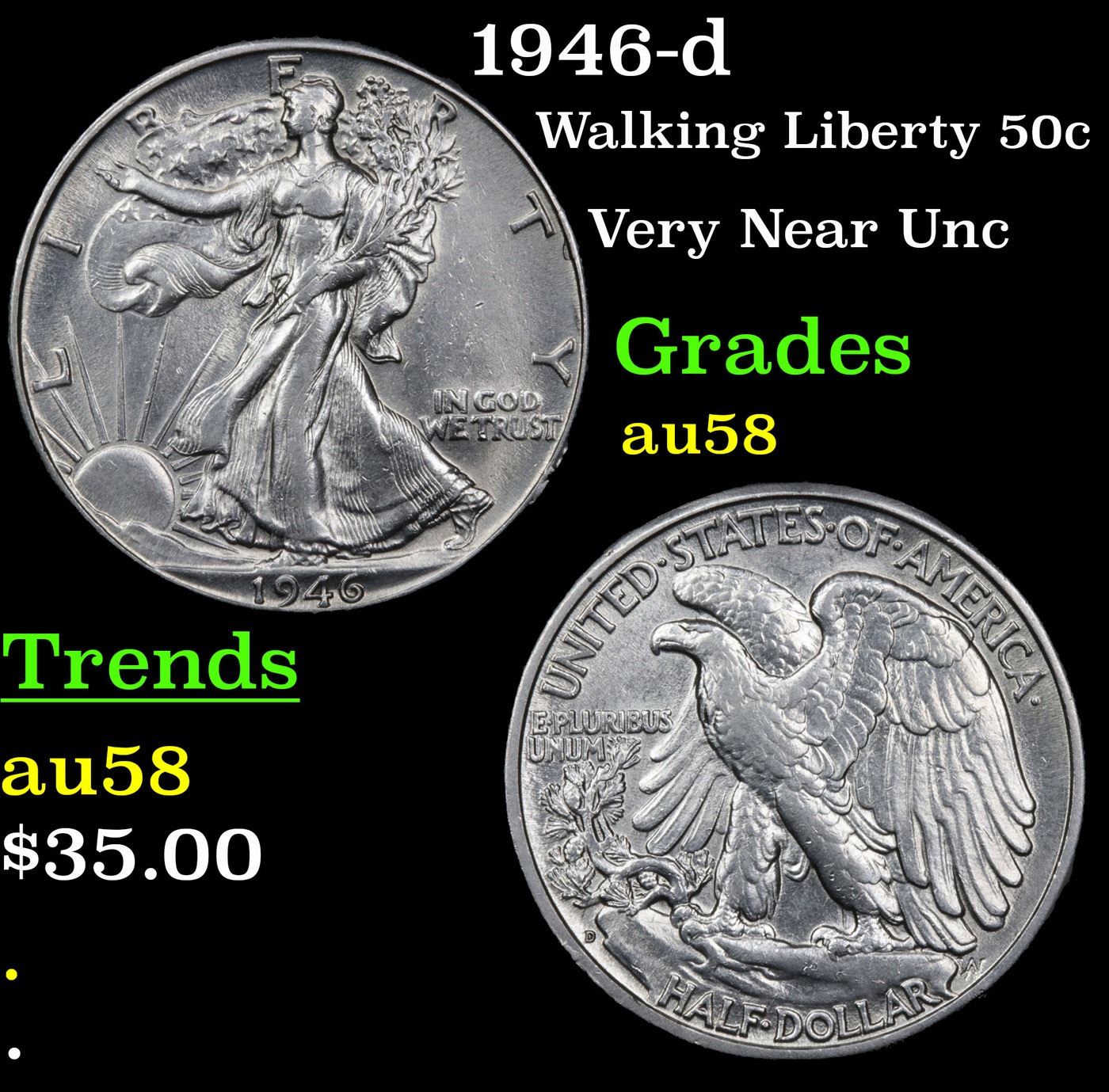 1946-d Walking Liberty Half Dollar 50c Grades Choice AU/BU Slider.