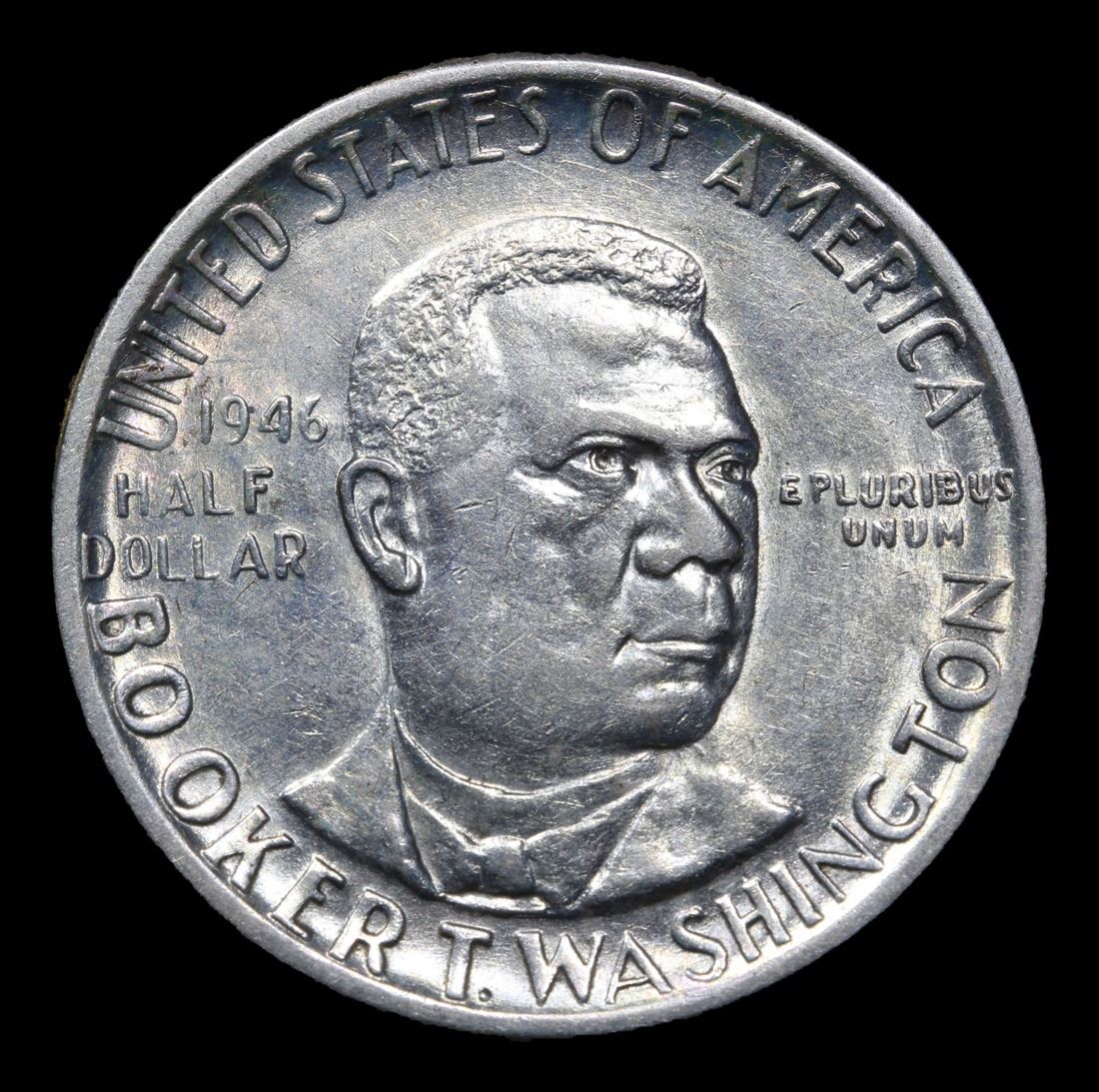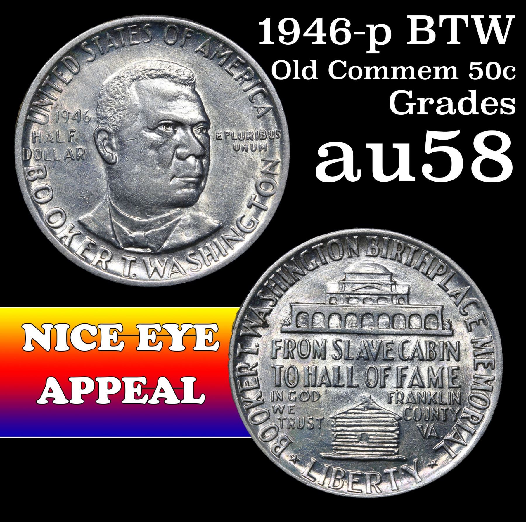1946-p BTW Old Commem Half Dollar 50c Grades Choice AU/BU Slider. When examining a Booker T. Washington commemorative look for wear on the high points, on the obverse that is Mr. Washington's right Cheek (from his perspective), and on the reverse the arches on the top building.