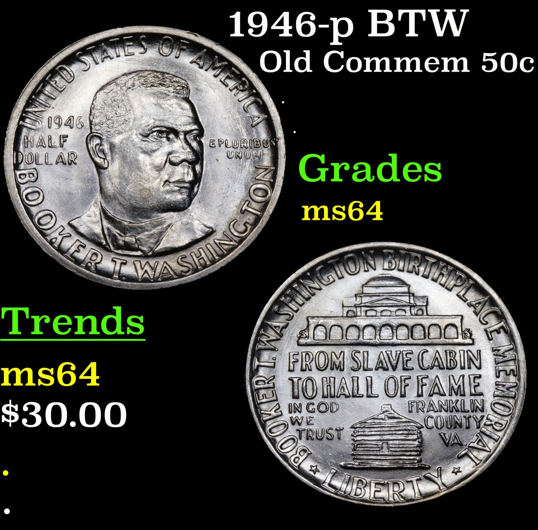 1946-p BTW . . Old Commem Half Dollar 50c Grades Choice Unc. When examining a Booker T. Washington commemorative look for wear on the high points, on the obverse that is Mr. Washington's right Cheek (from his perspective), and on the reverse the arches on the top building.