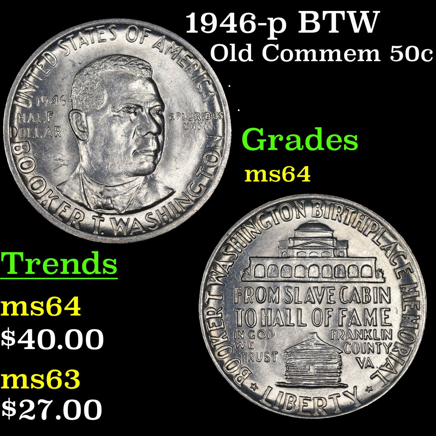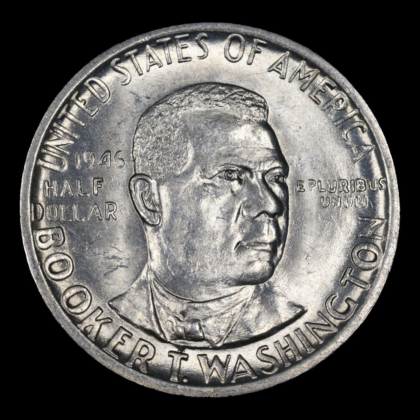 1946-p BTW Old Commem Half Dollar 50c Grades Choice Unc. When examining a Booker T. Washington commemorative look for wear on the high points, on the obverse that is Mr. Washington's right Cheek (from his perspective), and on the reverse the arches on the top building.