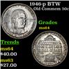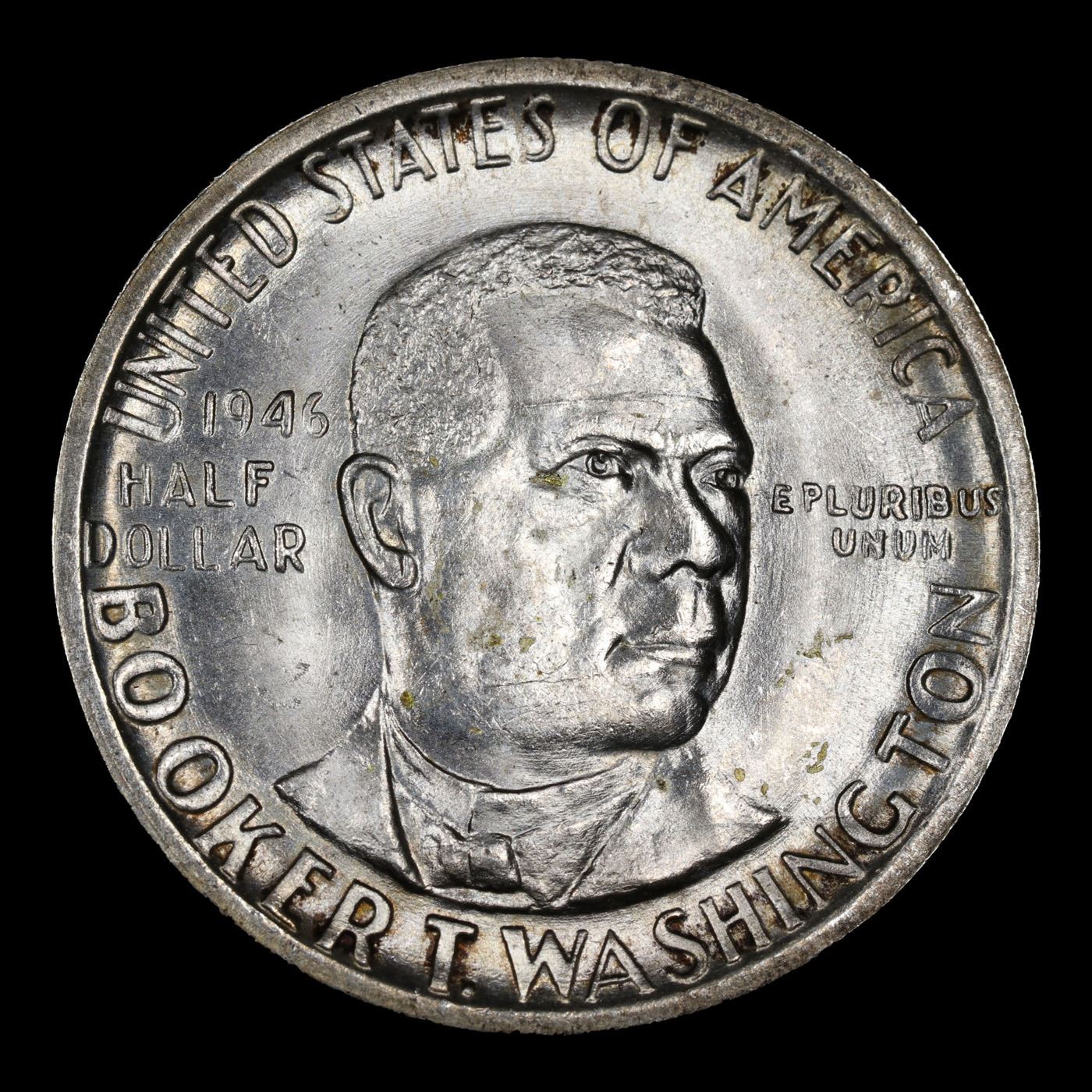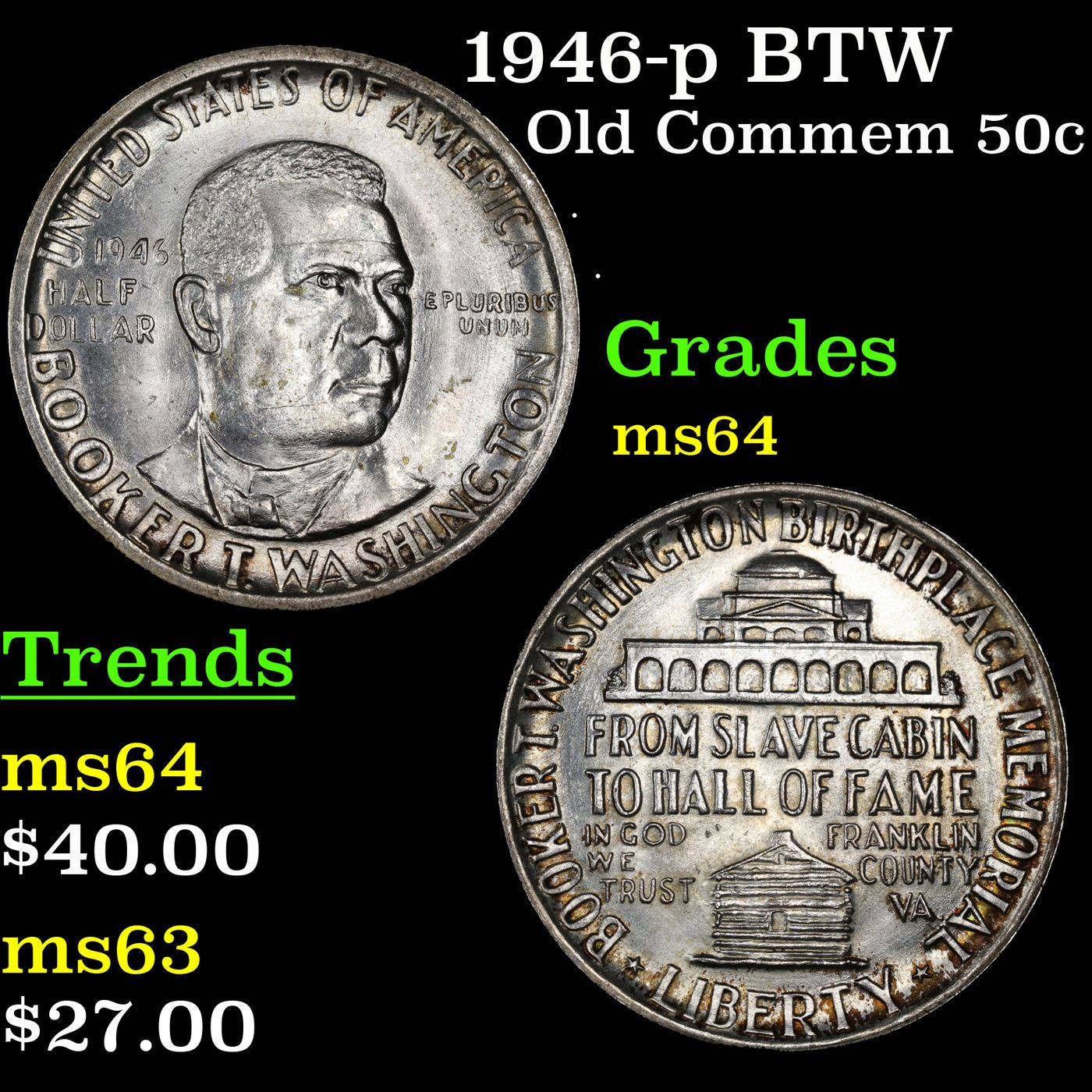 1946-p BTW Old Commem Half Dollar 50c Grades Choice Unc. When examining a Booker T. Washington commemorative look for wear on the high points, on the obverse that is Mr. Washington's right Cheek (from his perspective), and on the reverse the arches on the top building.
