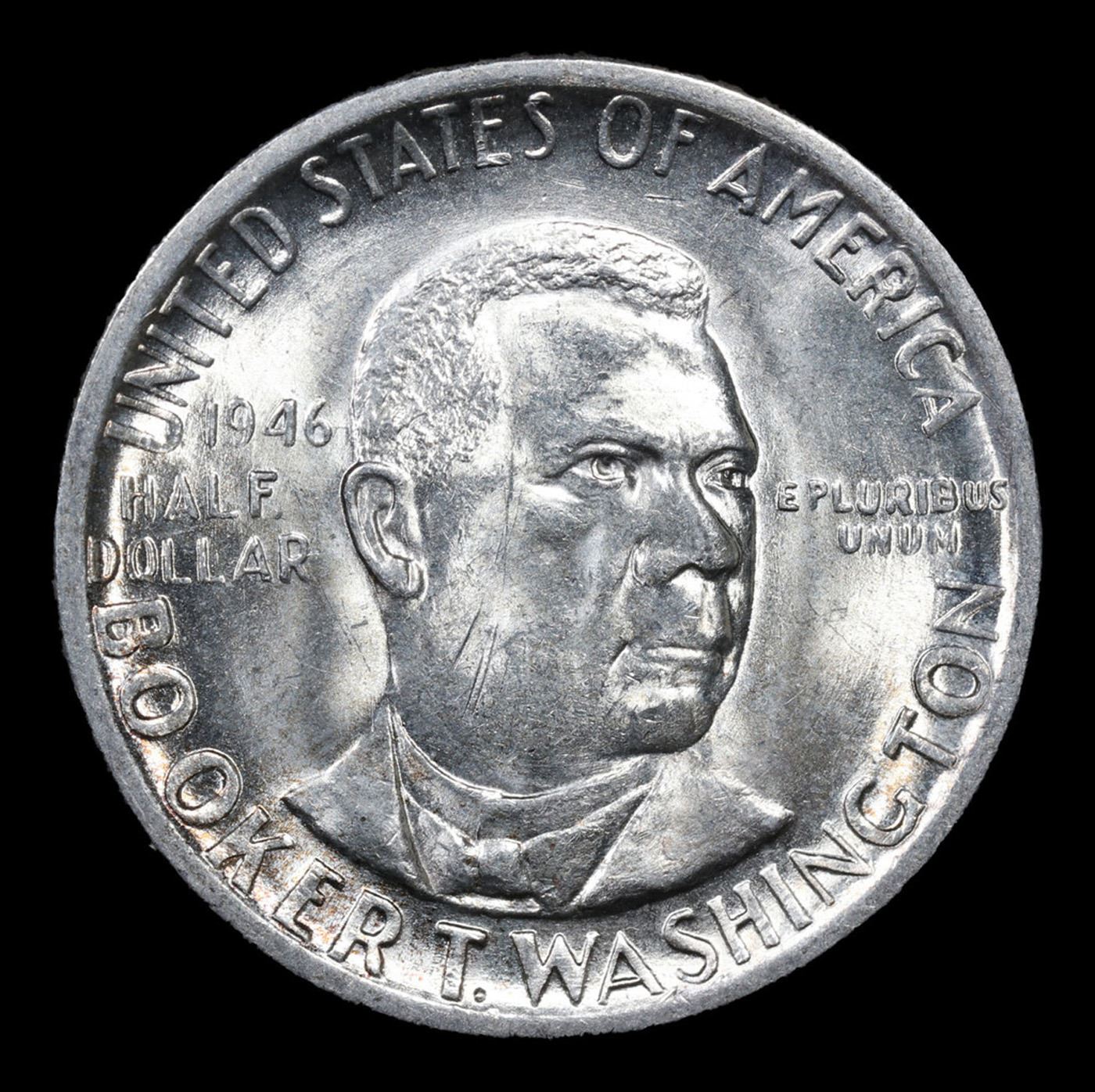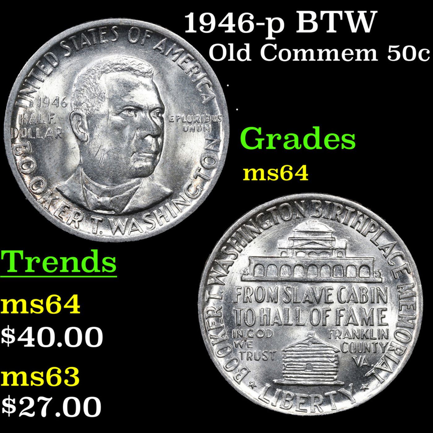1946-p BTW Old Commem Half Dollar 50c Grades Choice Unc. When examining a Booker T. Washington commemorative look for wear on the high points, on the obverse that is Mr. Washington's right Cheek (from his perspective), and on the reverse the arches on the top building.