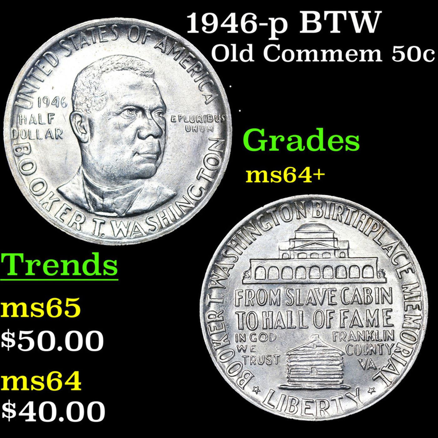 1946-p BTW Old Commem Half Dollar 50c Grades Choice+ Unc. When examining a Booker T. Washington commemorative look for wear on the high points, on the obverse that is Mr. Washington's right Cheek (from his perspective), and on the reverse the arches on the top building.