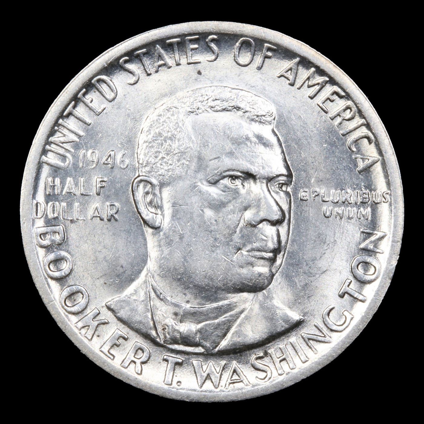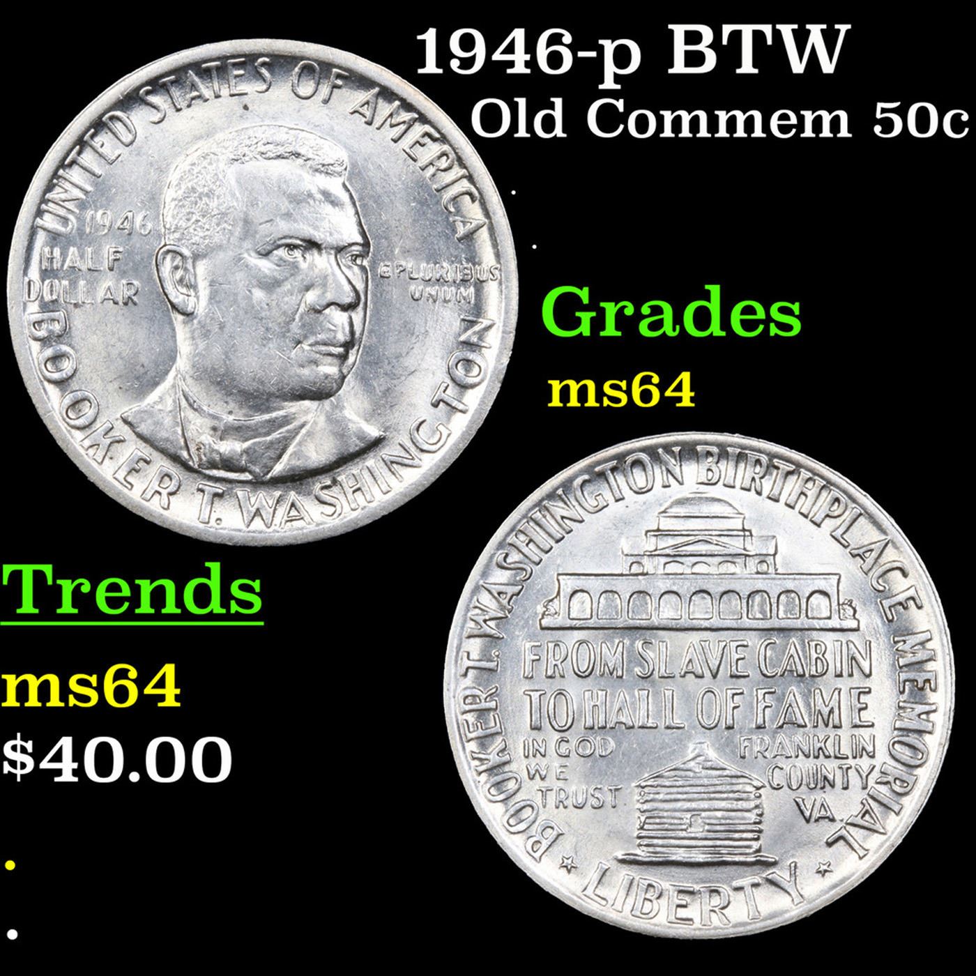 1946-p BTW Old Commem Half Dollar 50c Grades Choice Unc. When examining a Booker T. Washington commemorative look for wear on the high points, on the obverse that is Mr. Washington's right Cheek (from his perspective), and on the reverse the arches on the top building.