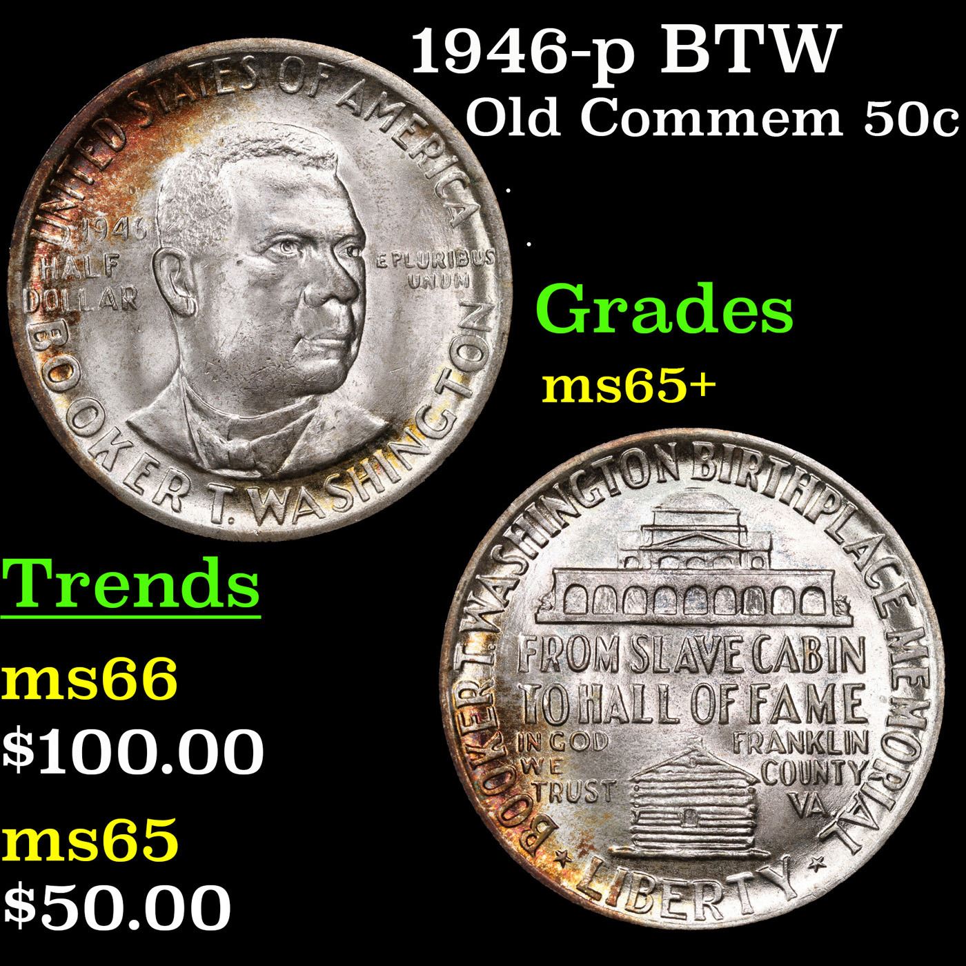 1946-p BTW Old Commem Half Dollar 50c Grades GEM+ Unc. When examining a Booker T. Washington commemorative look for wear on the high points, on the obverse that is Mr. Washington's right Cheek (from his perspective), and on the reverse the arches on the top building.
