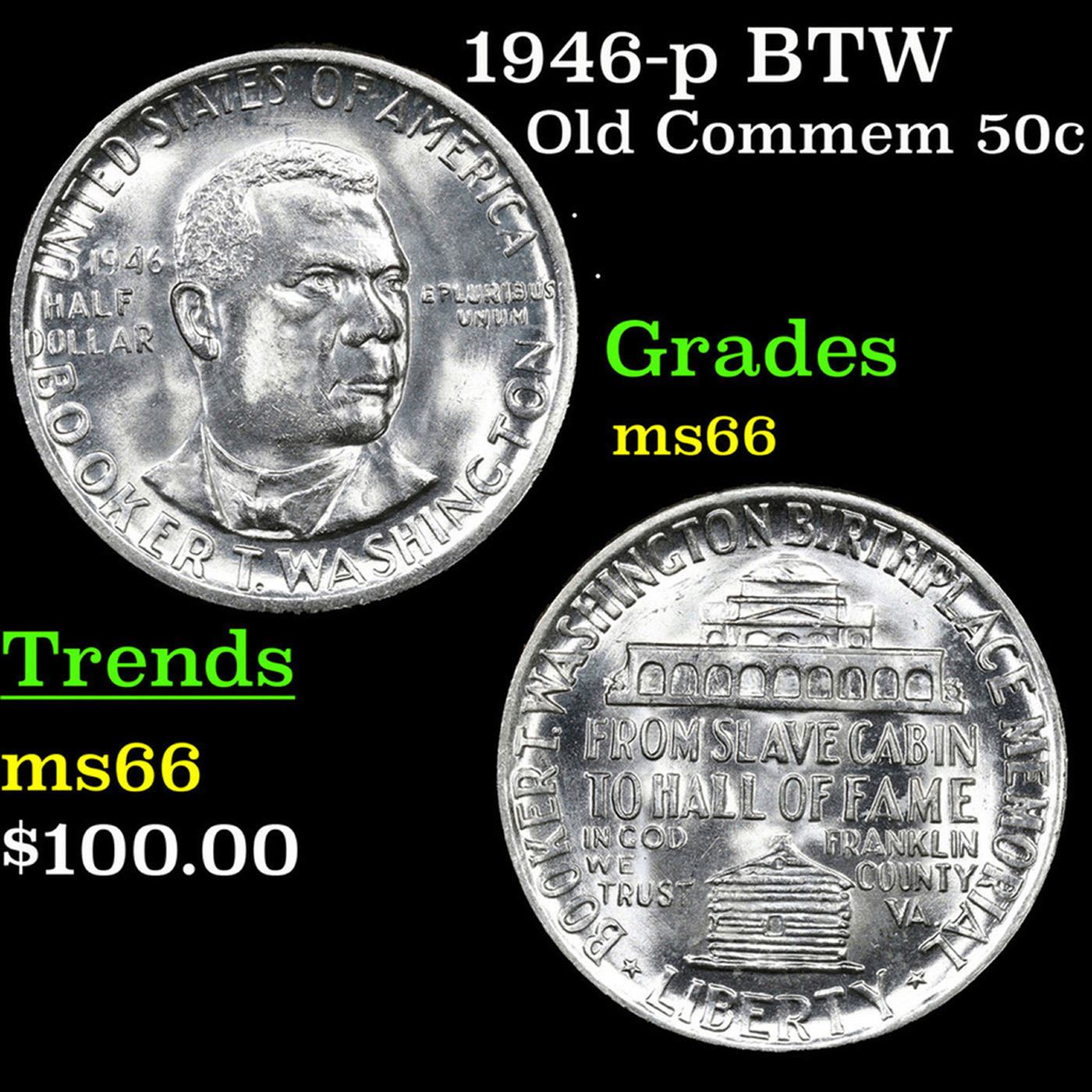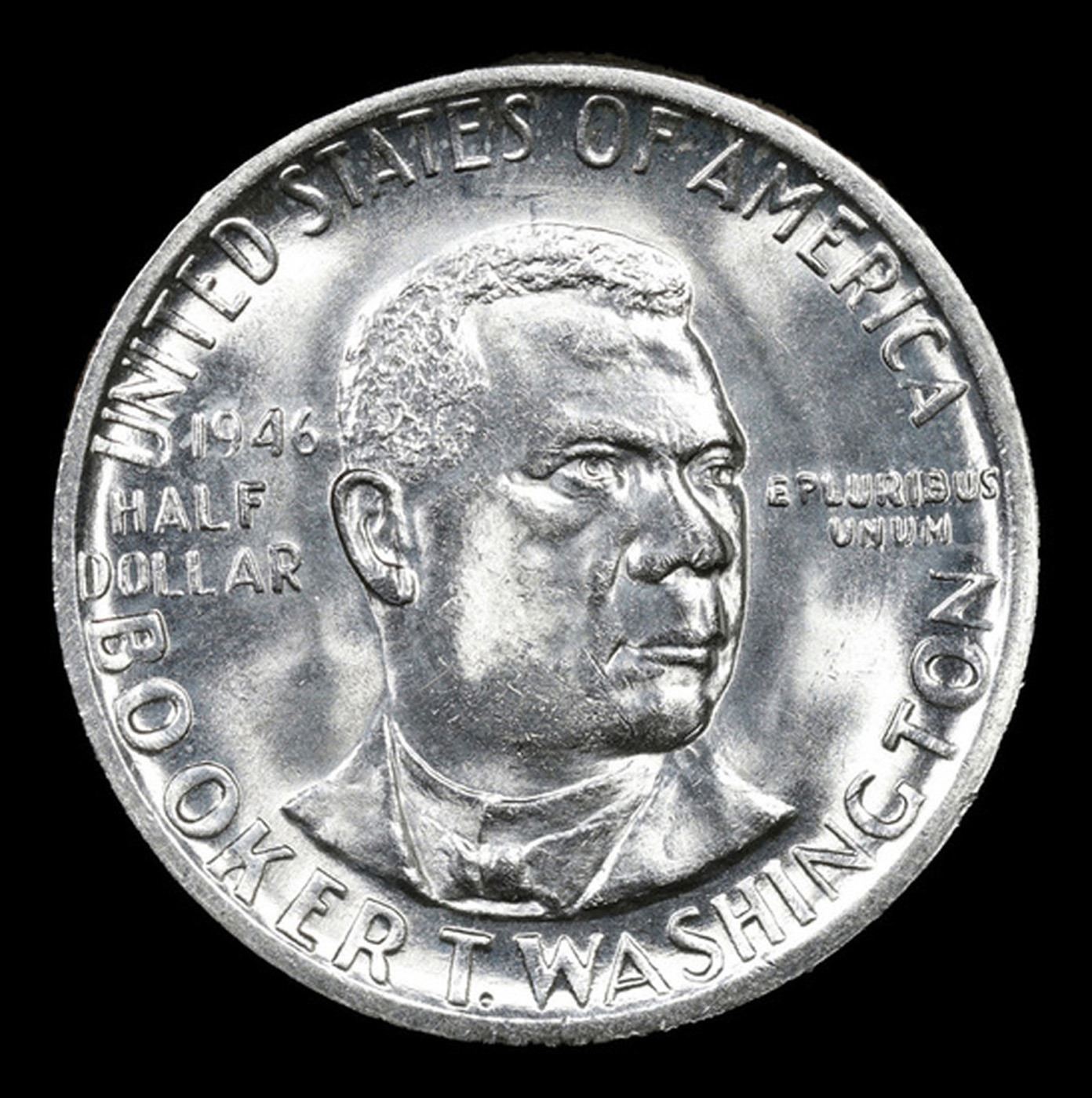 1946-p BTW Old Commem Half Dollar 50c Grades GEM+ Unc. When examining a Booker T. Washington commemorative look for wear on the high points, on the obverse that is Mr. Washington's right Cheek (from his perspective), and on the reverse the arches on the top building.