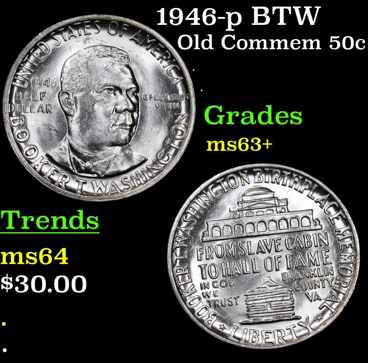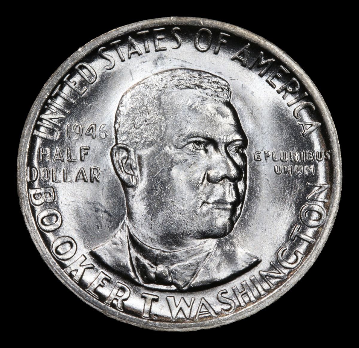 1946-p BTW . . Old Commem Half Dollar 50c Grades Select+ Unc. When examining a Booker T. Washington commemorative look for wear on the high points, on the obverse that is Mr. Washington's right Cheek (from his perspective), and on the reverse the arches on the top building.