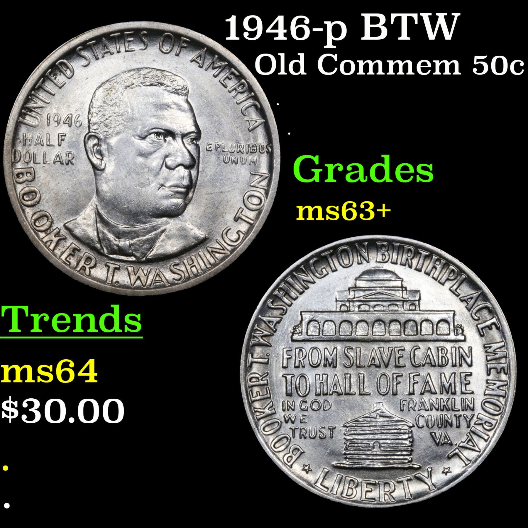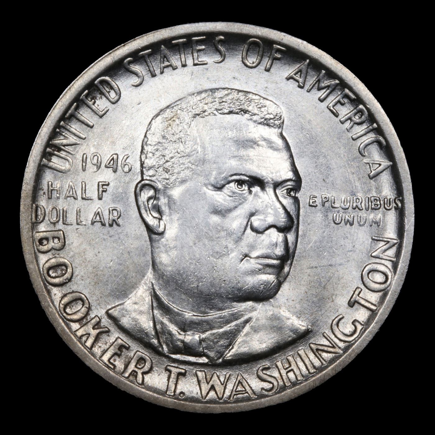 1946-p BTW Old Commem Half Dollar 50c Grades Select+ Unc. When examining a Booker T. Washington commemorative look for wear on the high points, on the obverse that is Mr. Washington's right Cheek (from his perspective), and on the reverse the arches on the top building.