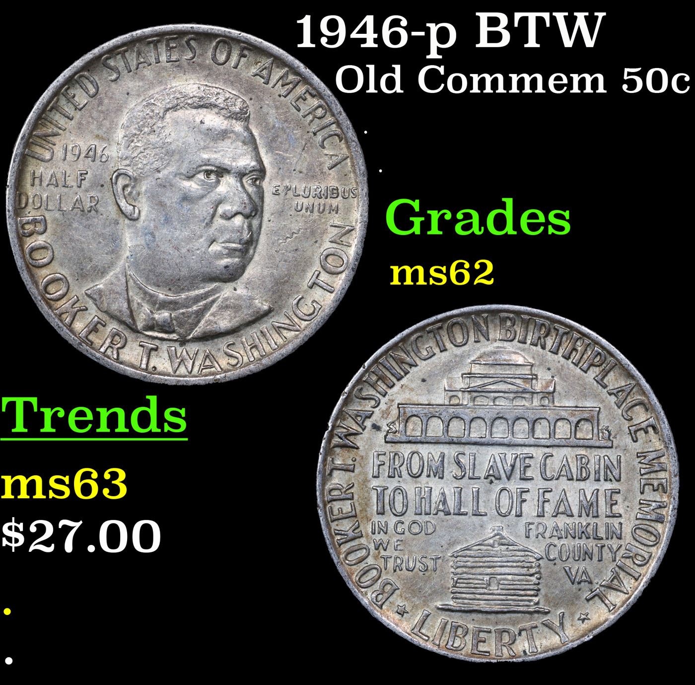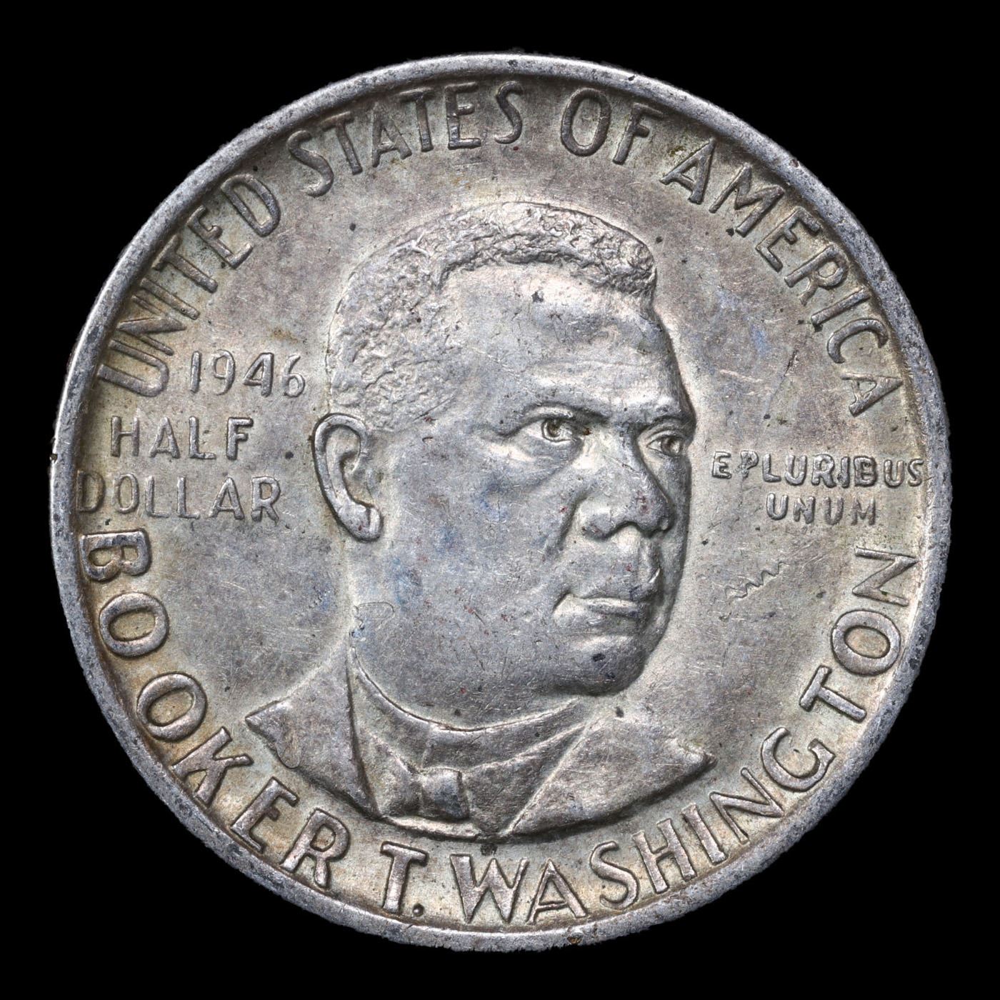 1946-p BTW Old Commem Half Dollar 50c Grades Select Unc. When examining a Booker T. Washington commemorative look for wear on the high points, on the obverse that is Mr. Washington's right Cheek (from his perspective), and on the reverse the arches on the top building.