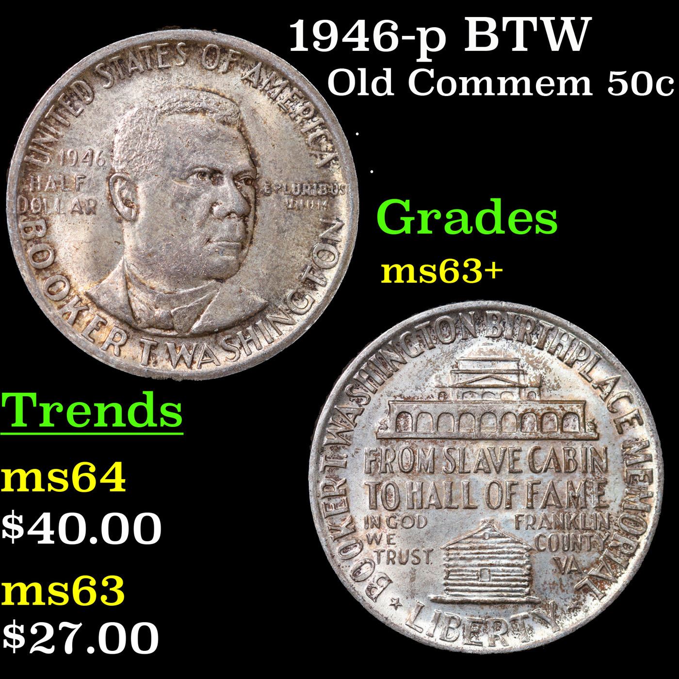 1946-p BTW Old Commem Half Dollar 50c Grades Select+ Unc. When examining a Booker T. Washington commemorative look for wear on the high points, on the obverse that is Mr. Washington's right Cheek (from his perspective), and on the reverse the arches on the top building.