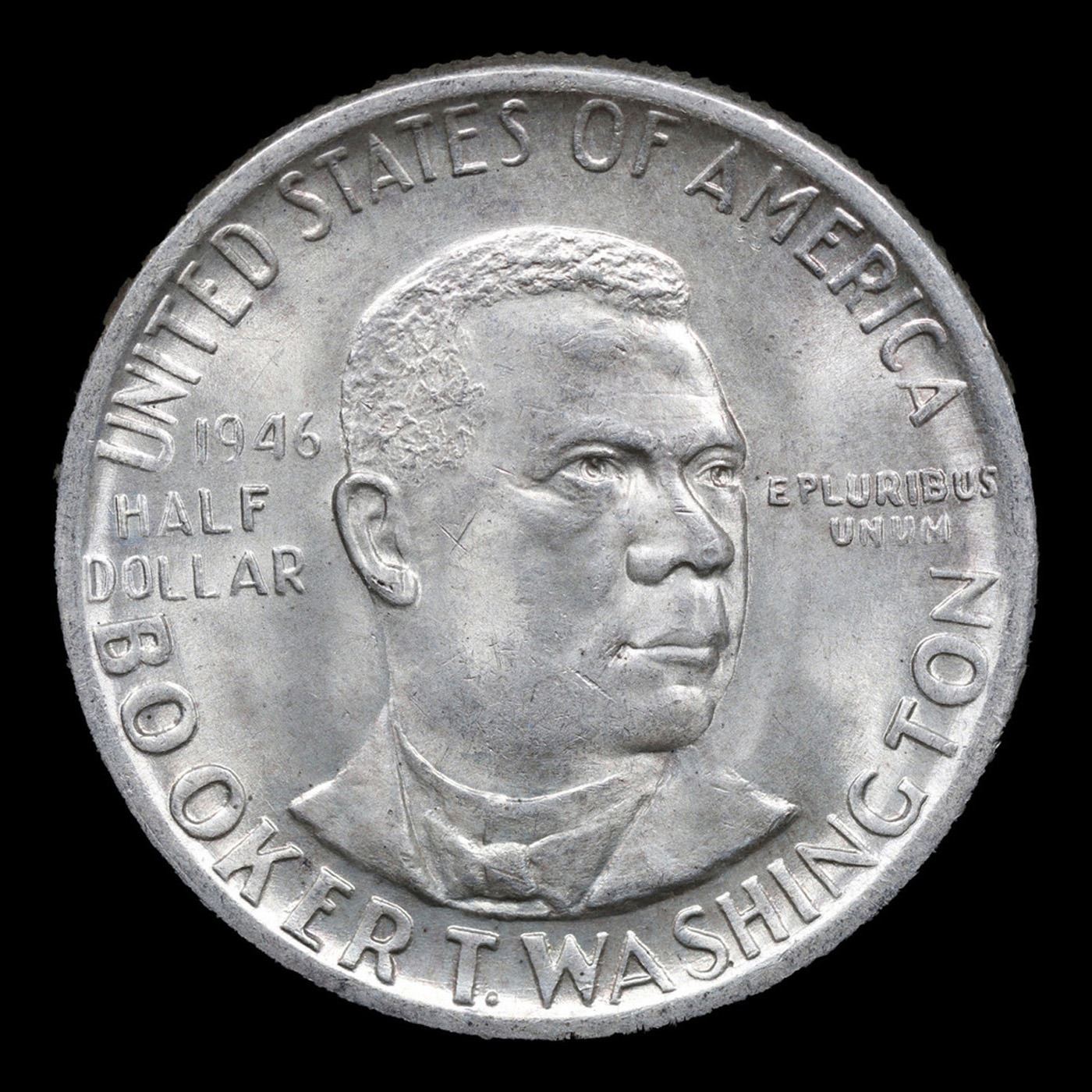 1946-p BTW Old Commem Half Dollar 50c Grades Select+ Unc. When examining a Booker T. Washington commemorative look for wear on the high points, on the obverse that is Mr. Washington's right Cheek (from his perspective), and on the reverse the arches on the top building.