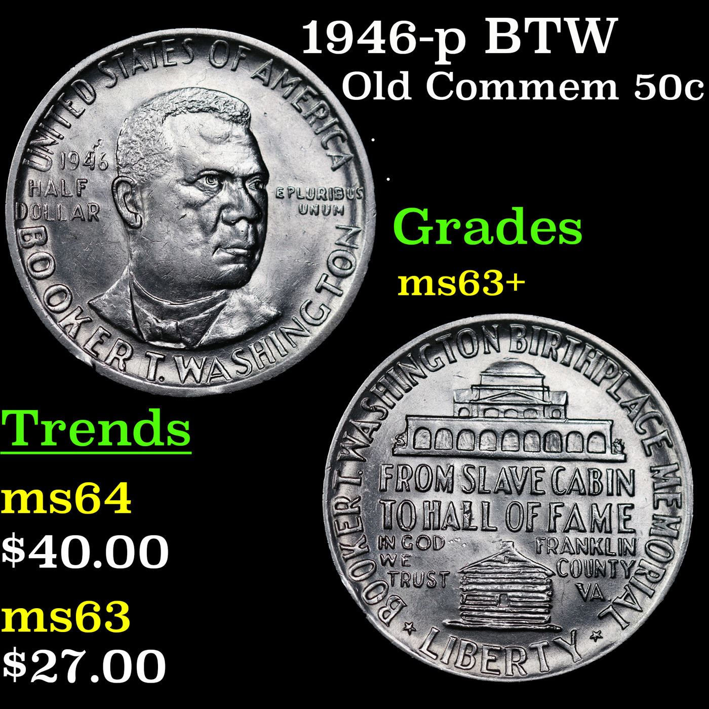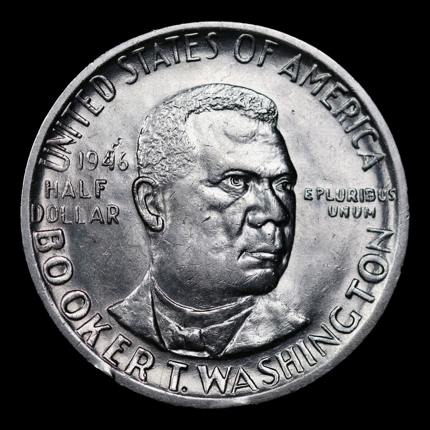 1946-p BTW Old Commem Half Dollar 50c Grades Select+ Unc. When examining a Booker T. Washington commemorative look for wear on the high points, on the obverse that is Mr. Washington's right Cheek (from his perspective), and on the reverse the arches on the top building.