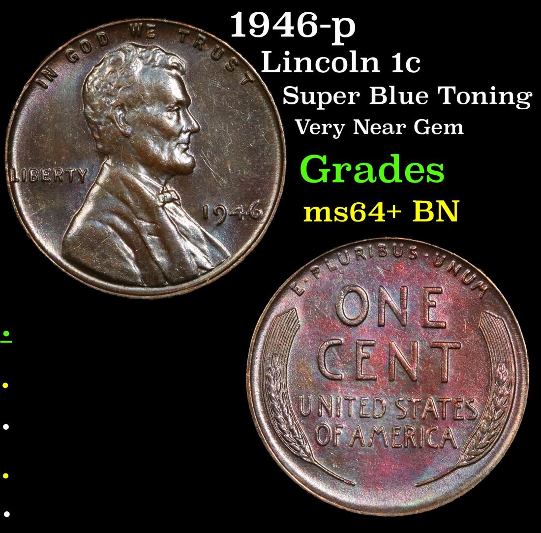 1946-p Super Blue Toning Very Near Gem Lincoln Cent 1c Grades Choice+ Unc BN.