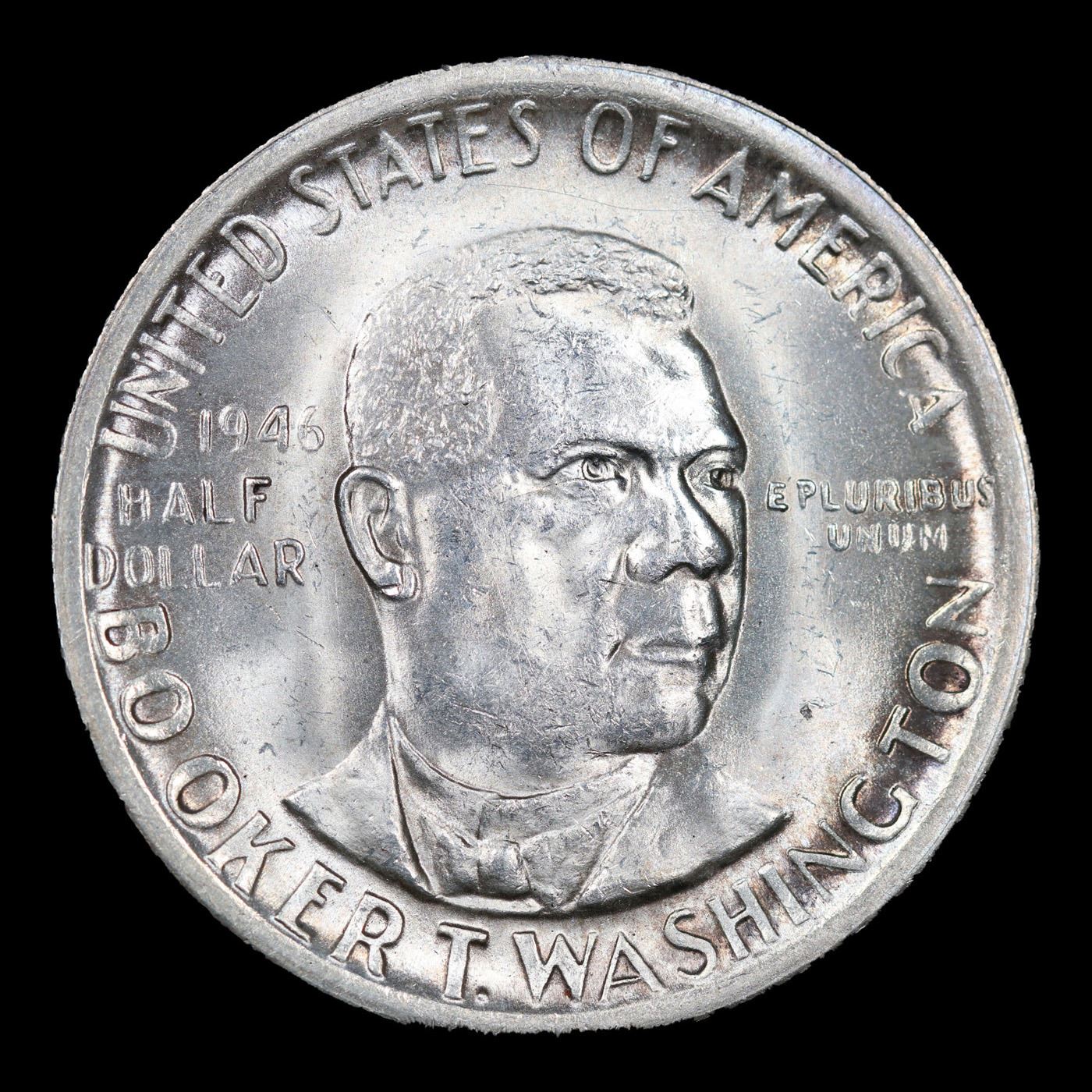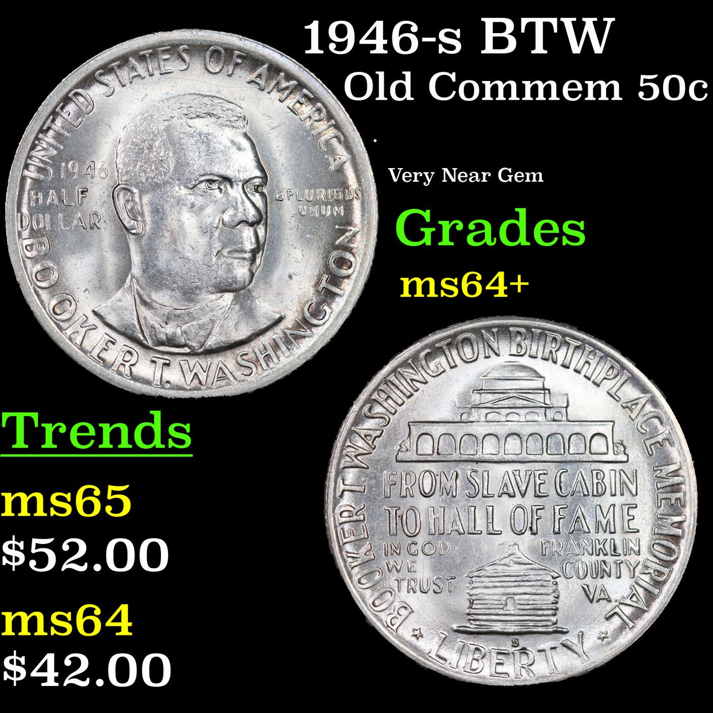 1946-s BTW Old Commem Half Dollar 50c Grades Choice+ Unc. When examining a Booker T. Washington commemorative look for wear on the high points, on the obverse that is Mr. Washington's right Cheek (from his perspective), and on the reverse the arches on the top building.