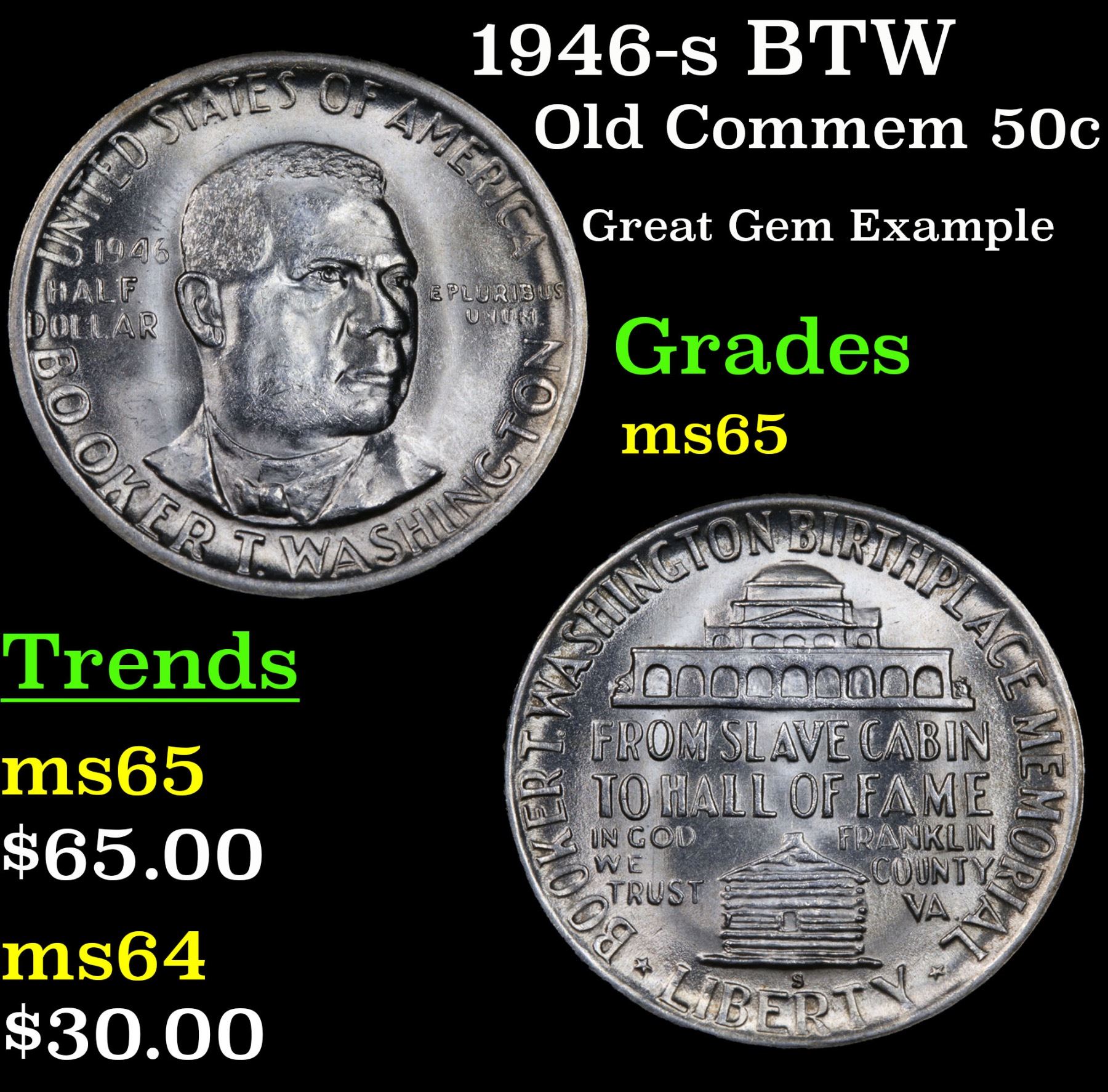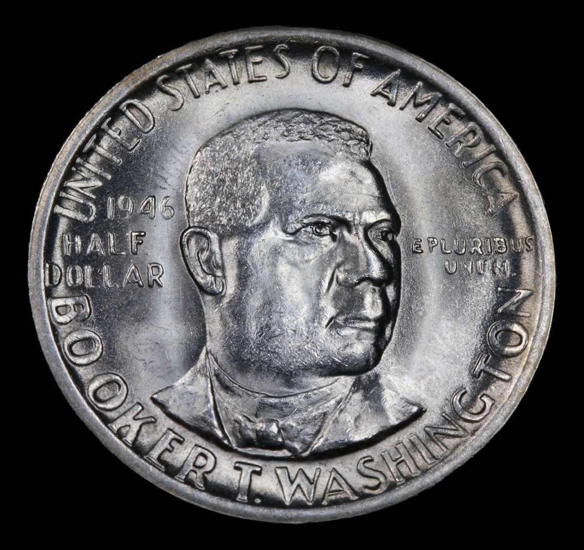 1946-s BTW Old Commem Half Dollar 50c Grades GEM Unc. When examining a Booker T. Washington commemorative look for wear on the high points, on the obverse that is Mr. Washington's right Cheek (from his perspective), and on the reverse the arches on the top building.