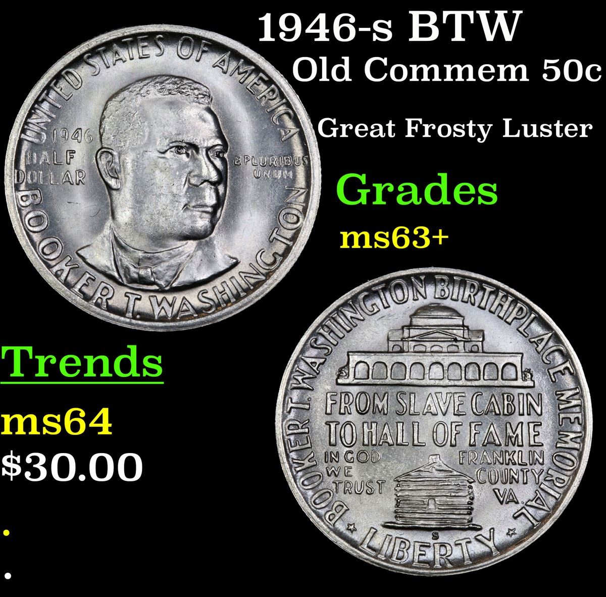1946-s BTW Old Commem Half Dollar 50c Grades Select+ Unc. When examining a Booker T. Washington commemorative look for wear on the high points, on the obverse that is Mr. Washington's right Cheek (from his perspective), and on the reverse the arches on the top building.