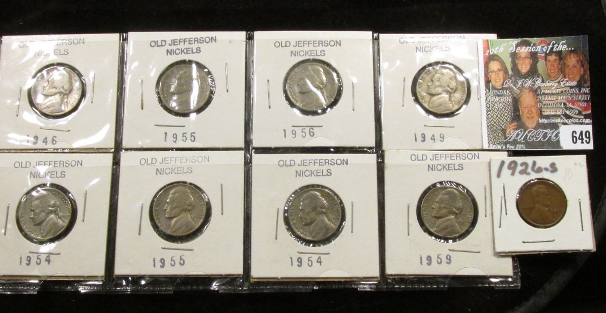 1946S, 49P, (2) 54D, (2) 55D, 56D,& 59D Better grade Jefferson Nickels; & a Rare 1926 S Cent in Fine condition.
