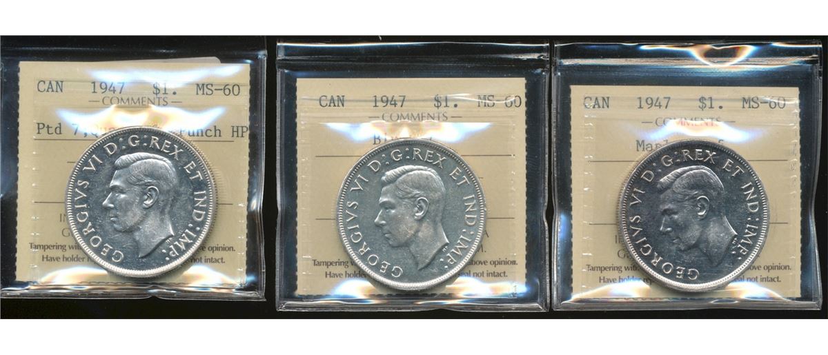1947 $1 Blt, ML & Ptd 7 Quad HP all ICCS MS60. Lot of 3 key date issues.