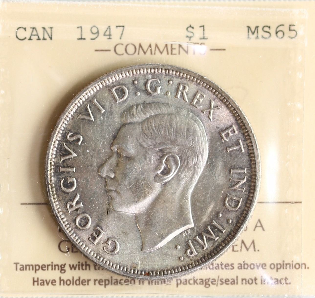 1947 $1 "Blunt 7" ICCS Gem Mint state-65. This Gem Silver Dollar is well struck with full original lustre. We have offered just two other Gem examples in the past. A superb and noteworthy opportunity for the quality conscious silver dollar variety collector.
