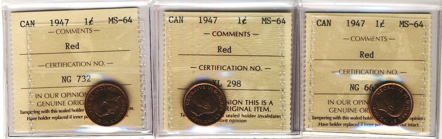 1947 1¢ ICCS MS64RD. Lot of 3 coins.