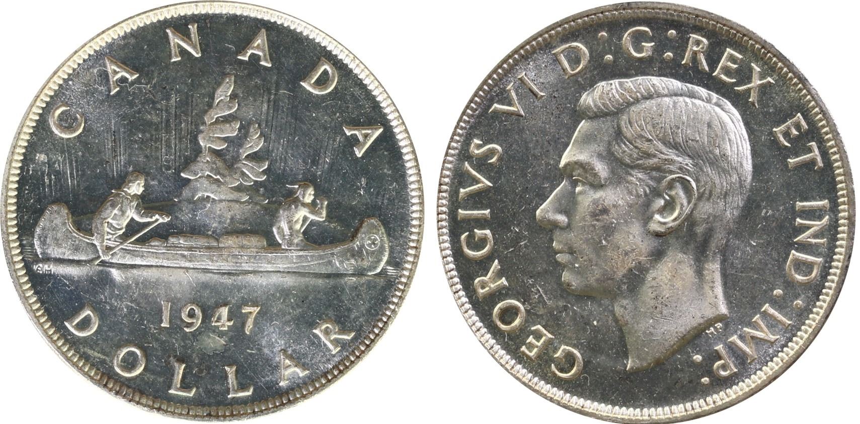 1947 $1 ICCS "Pointed 7, 2 X HP, Wrong Font 4/4 CH# Rev-005" ICCS Very Choice Mint State-64. First example offered in this grade and likely the finest known. An unimrovable example of this rare and interesting variety. CH# Rev-005, better known as the "wrong font 4/4" variety, was created when the date was being punched into the coin die. Instead of using the appropriate 4 punch seen on all silver dollars, a mint employee accidentally used the much smaller and different font punch intended for the dies used to strike fifty cent pieces. To correct this major die cutting error, the proper punch was used on the same die instead of creating a new die, leading to a very prominent re-punched 4/4 where the shape of the different sizes and fonts strongly overlap creating an impressive visual effect. No other wrong font error is known in the entire silver dollar series, in fact it is a remarkably rare type of error in it's own right, with the few other instances of it occurring being in the Victorian series. The coin itself is almost certainly the finest known example of this variety, considering gem representatives of any pointed 7 type are prohibitively rare. This is a very high quality example for the grade, with no major distracting marks, and reflective fields which contrast nicely with the cameo portrait of King George. This is an excellent and unbeatable opportunity for those who collect quality silver dollars or the many varieties of the 1947 series, no other sales exist to compare this piece to.