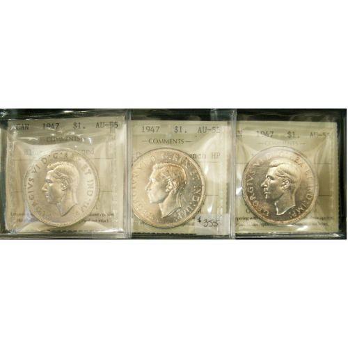1947 $1. Lot of 3 coins including, 1947 ML, 1947 Ptd and 1947 Bl (cleaned) all graded ICCS AU55.