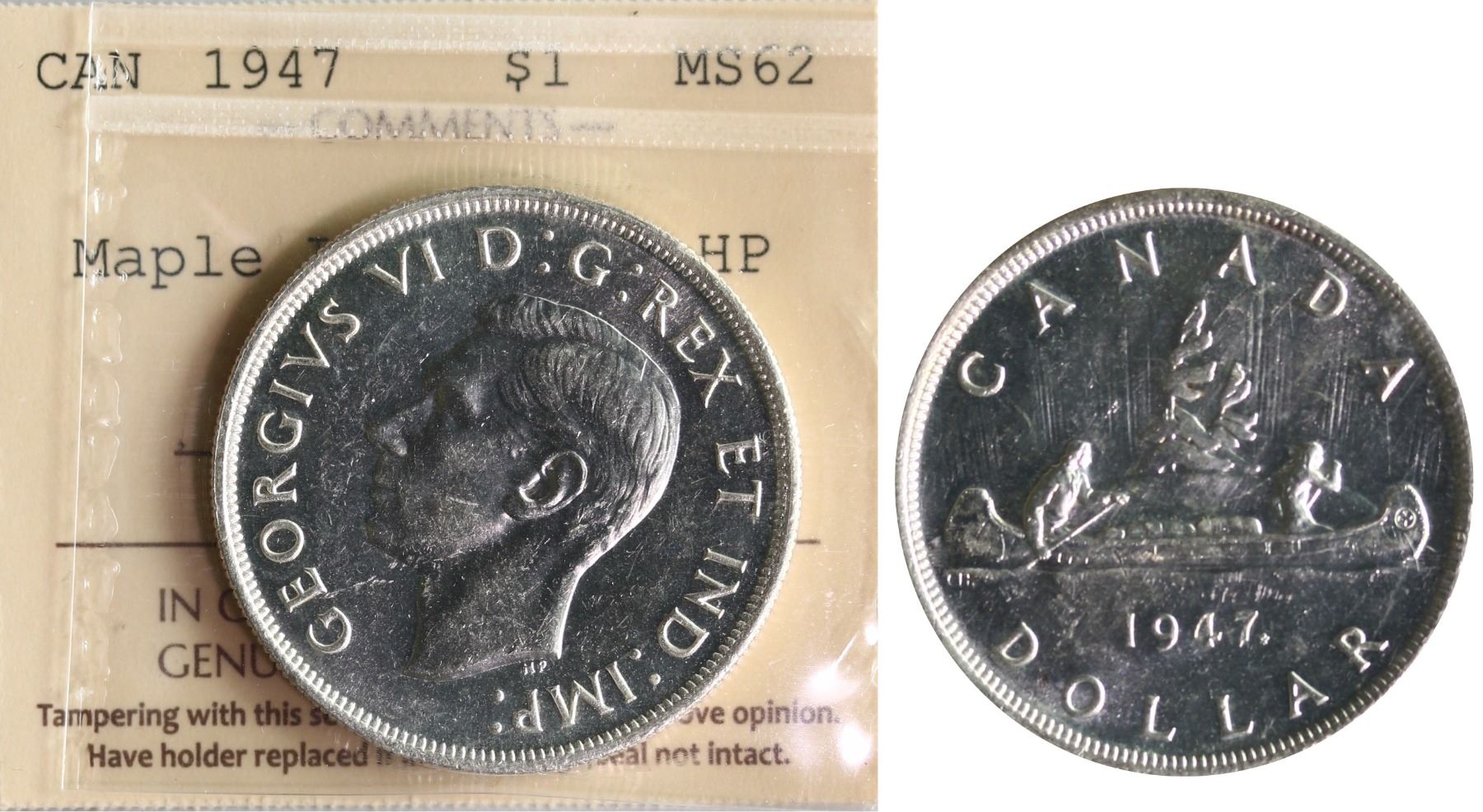 1947 $1 "ML - 2X HP" ICCS Choice Mint State-62 Brilliant and lustrous