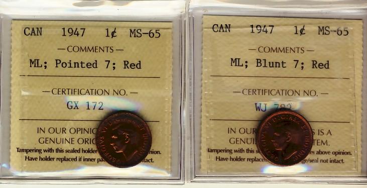 1947 1¢ ML Blt7 & ML Ptd7 ICCS MS65RD. Lot of 2 coins.