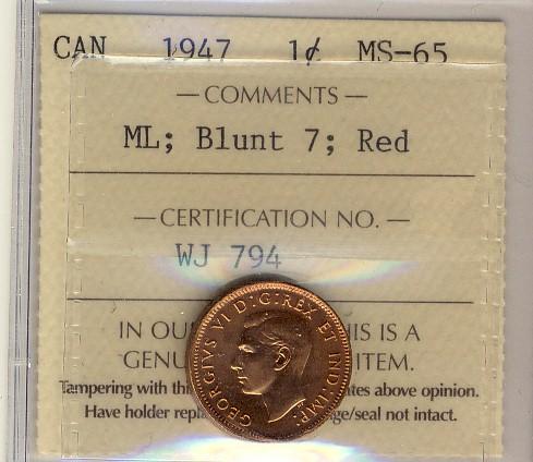 1947 1¢ ML Blunt 7 ICCS MS65RD. Gem full red example.