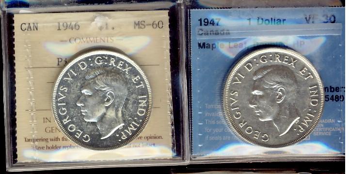 1947 $1 ML Dbl HP CCCS VF30 & 1946 ICCS MS60. Lot of 2 coins.
