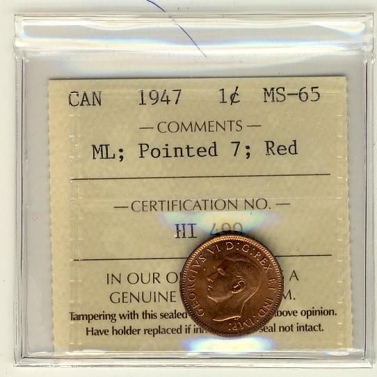 1947 1¢ ML Ptd 7 ICCS MS65 Red.