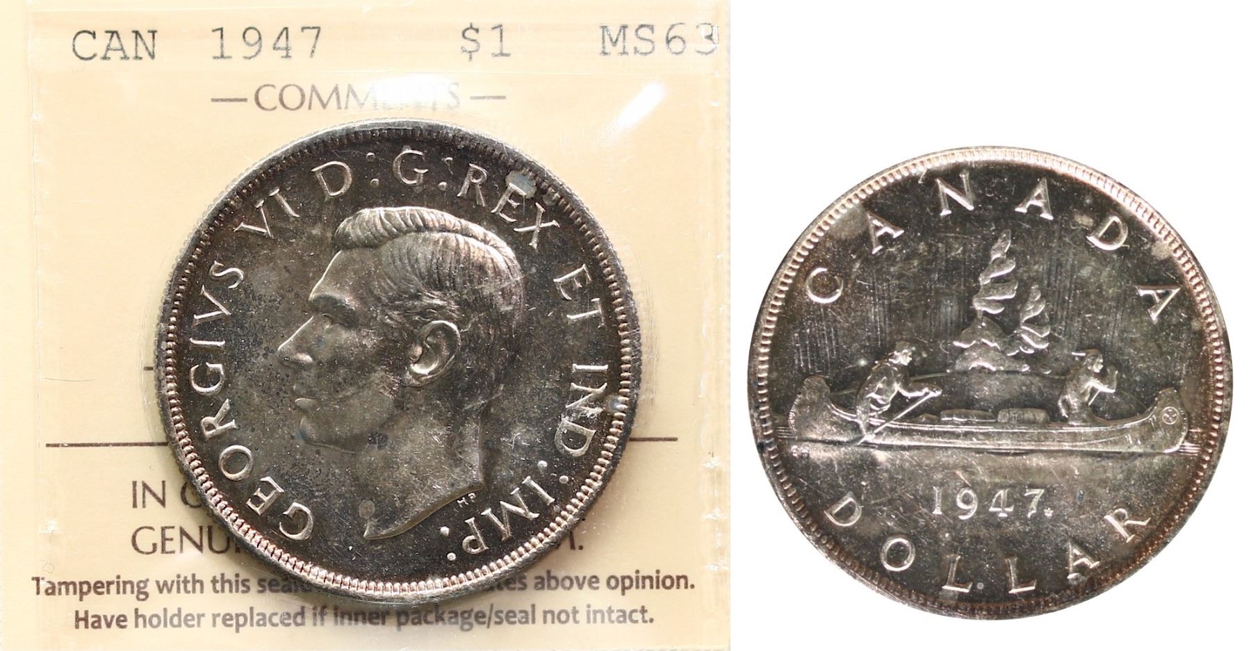 1947 $1 "Maple Leaf" ICCS Choice Mint State-63, Delicate russet tone over full underlying lustre. A nice example.