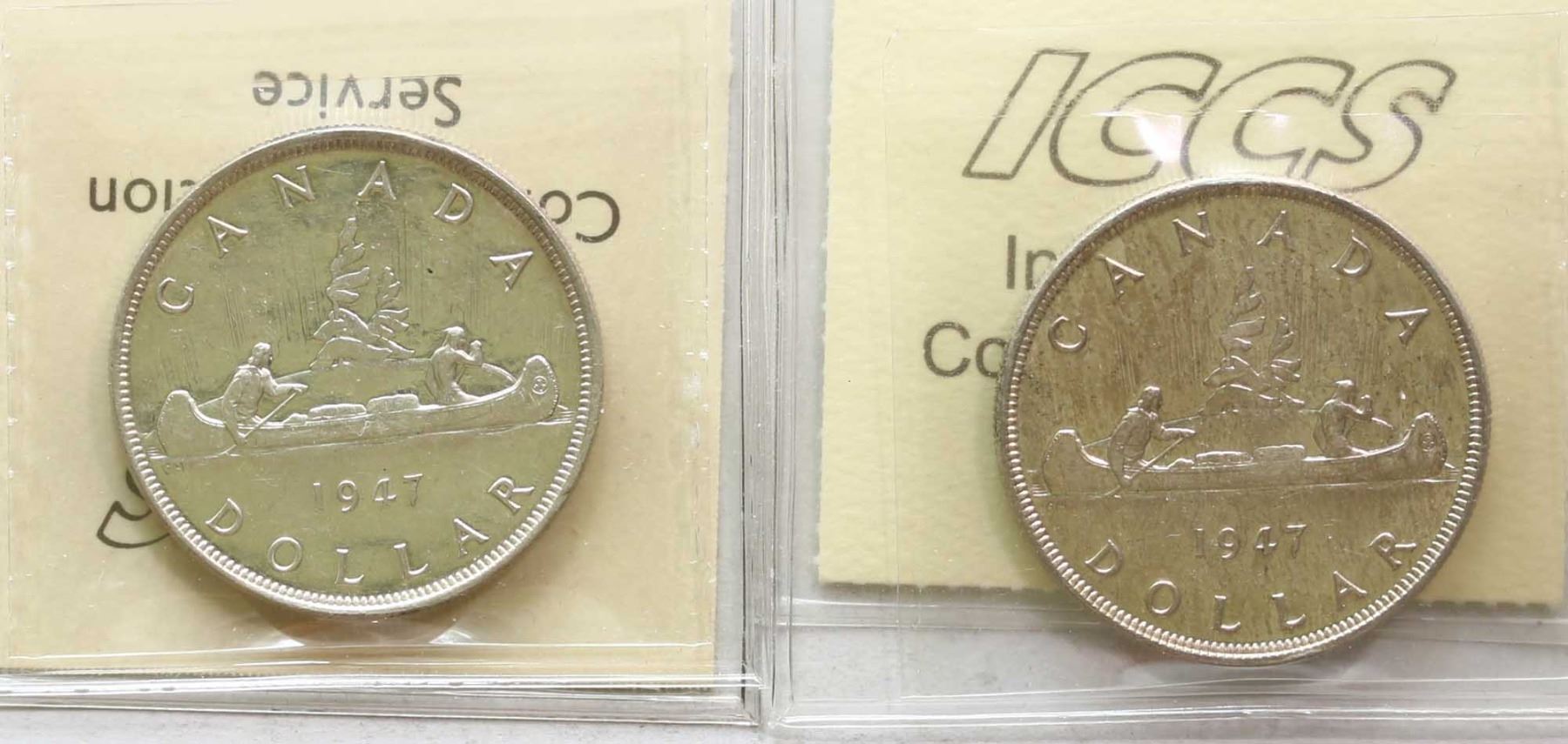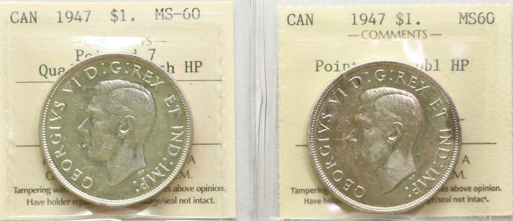 1947 $1 "Pointed 7 - 2 X HP", 1947 "Pointed 7 - 4 X HP" Both coins ICCS Mint State-60 Brilliant and lustrous.
