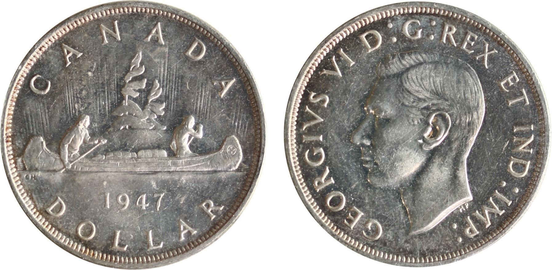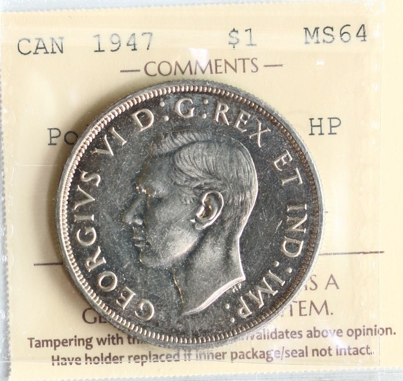 1947 $1 "Pointed 7 - 2 X HP" ICCS Very Choice Mint State-64, Delicate gold and russet tones over full lustre. Very scarce in this condition.