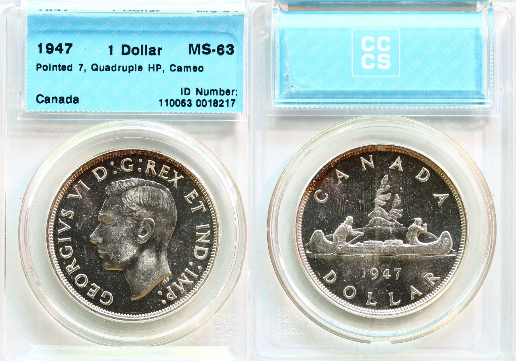 1947 $1 "Pointed 7 - 4 X HP" CCCS Choice Mint State-63 Cameo. A well struck example with full lustre. A superb and appealing coin.