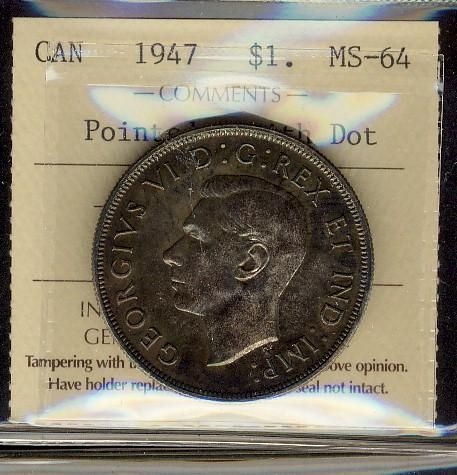 1947 $1 Ptd w/dot ICCS MS64. TIED for finest known. VERY RARE! UNDERRATED!