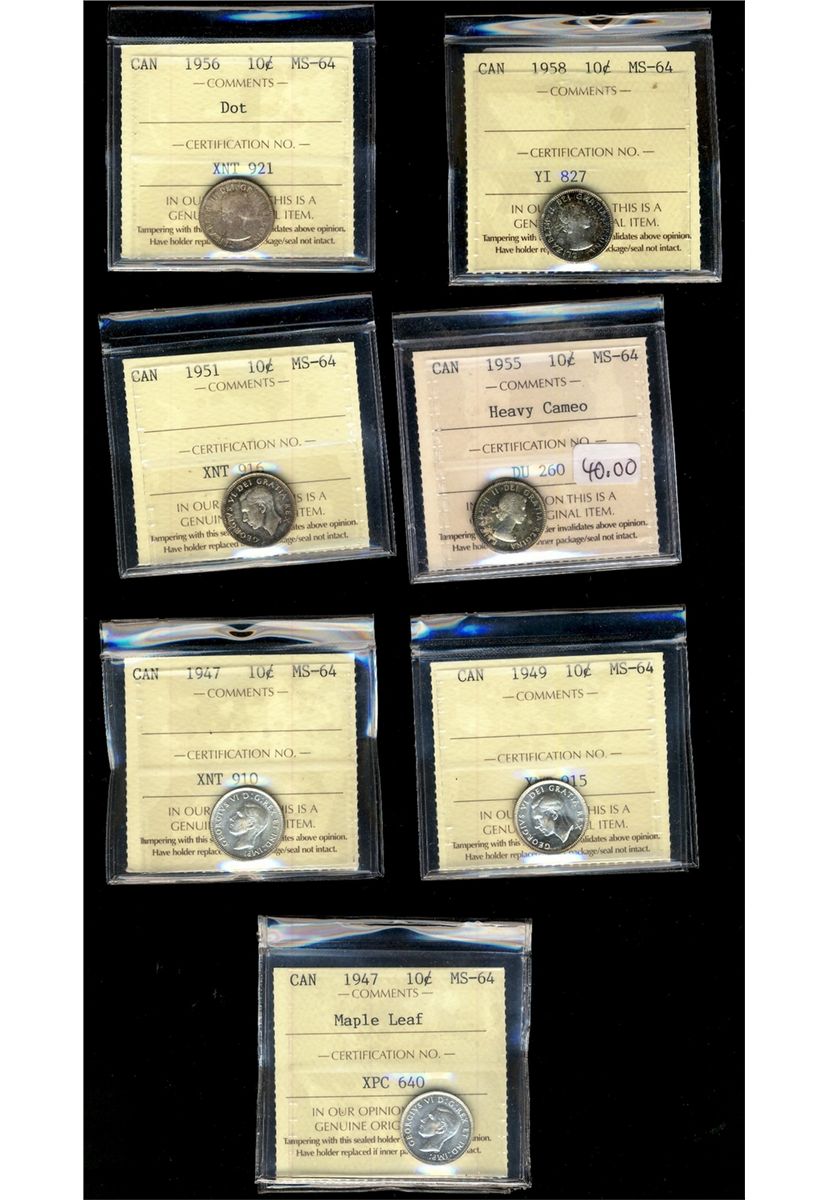 1947 10¢, 1947ML, 1949, 1951, 1955, 1956 & 1958 all ICCS MS64. Lot of 7 pcs.
