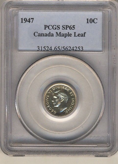1947 10 Cents PCGS SP-65; Maple Leaf.