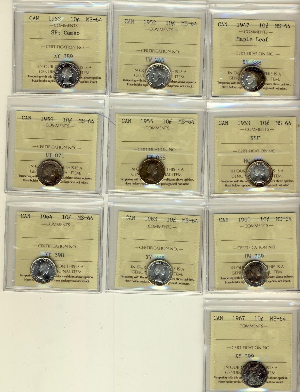 1947 10¢ ML, 1952, 1953 SF, NSf, 1955, 1959, 1960, 1963, 1964 & 1967 ICCS MS64. Lot of 10 coins.