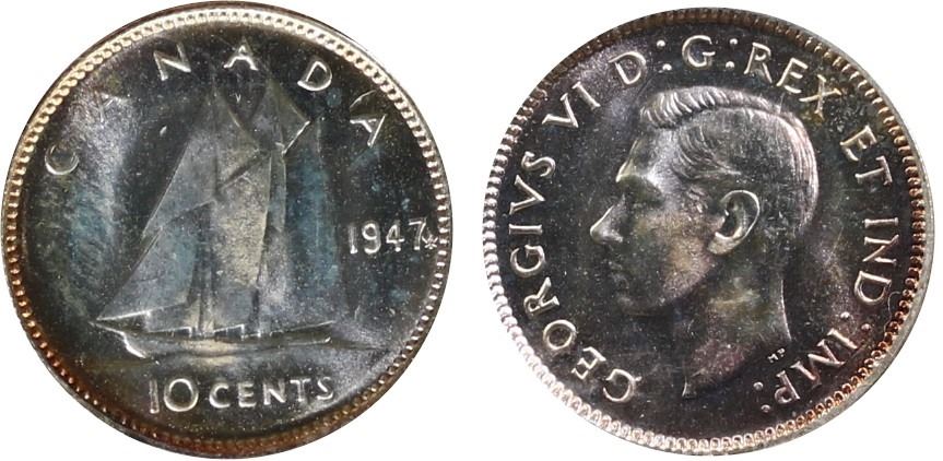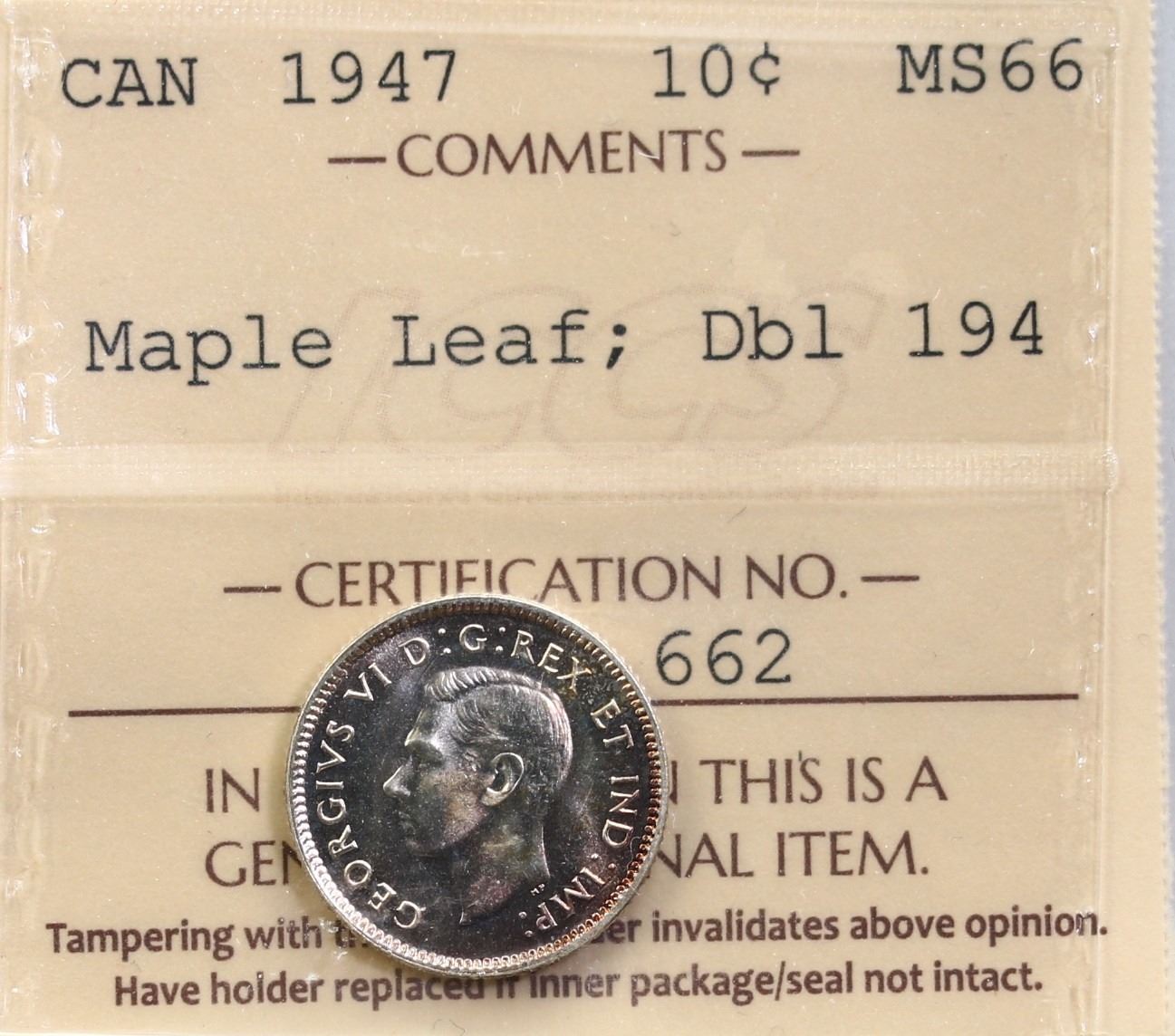 1947 10¢ "Maple Leaf, DBL 194" ICCS Superb Gem Mint State-66. A finest known example with the popular and unlisted date doubling variety. An undeniably beautiful coin, the faintest reddish golden toning dances around the rims, giving way to the most spectacular uninterrupted cartwheel luster which one could hope for. Not a single mark worthy of mention, this coin does not just hold up to the superb gem grade but exemplifies it in technical quality and in beauty. The cherry on top of this already delicious example is the nicely doubled "194" of the date, which is unlisted in trends for this particular issue, but which is very popular on other years such as 1938. Undoubtedly the doubling on the date of this piece is much more difficult to encounter than on those years which are listed in trends, something to take note of when considering this excellent piece. A lovely opportunity for those who collect this series of dimes and pursue these difficult doubled date varieties. A 1938 "Dbl 193" in Choice Mint State-64 brought it $896 at the 2025 Summer Sale.