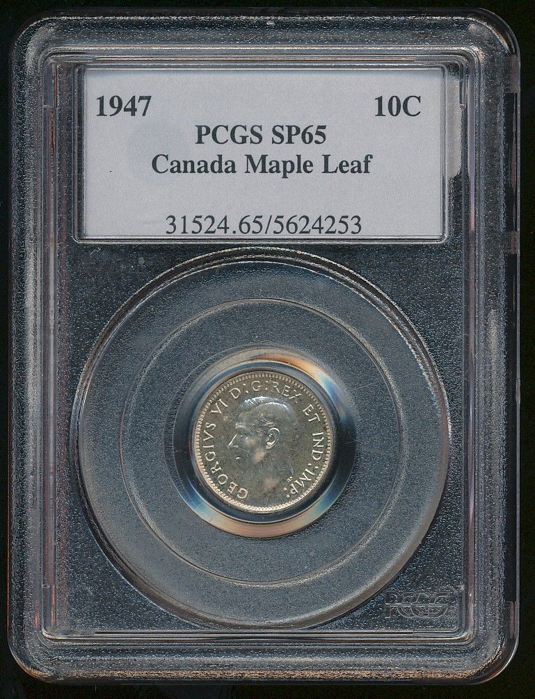 1947 10¢ PCGS SP-65; Maple Leaf.