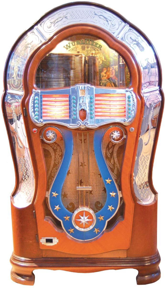 1947 "1080" Colonial, Wurlitzer Juke Box. Minor wear and small break on side mirror otherwise very good working condition. 30 X 58 X 24 inches.