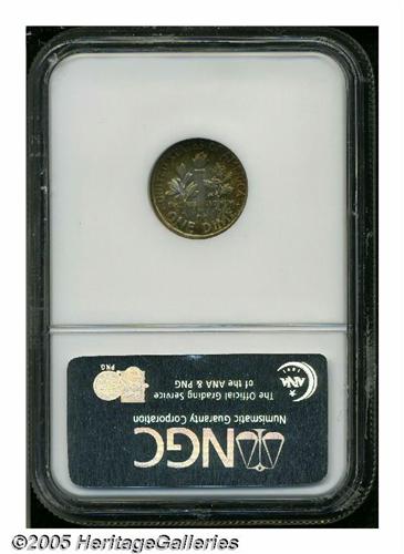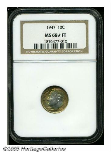 <B>1947<10C> MS68 <S Full Torch NGC.</B></I> Vivid forest-green and ruby-red colors dominate the margins, while the centers are lightly toned. A well struck and nearly immaculate second year example. As of (4/05), the single finest NGC-certified 1947 Dime, three others are encapsulated as MS68 by that service, but without a star or a Full Torch designation.