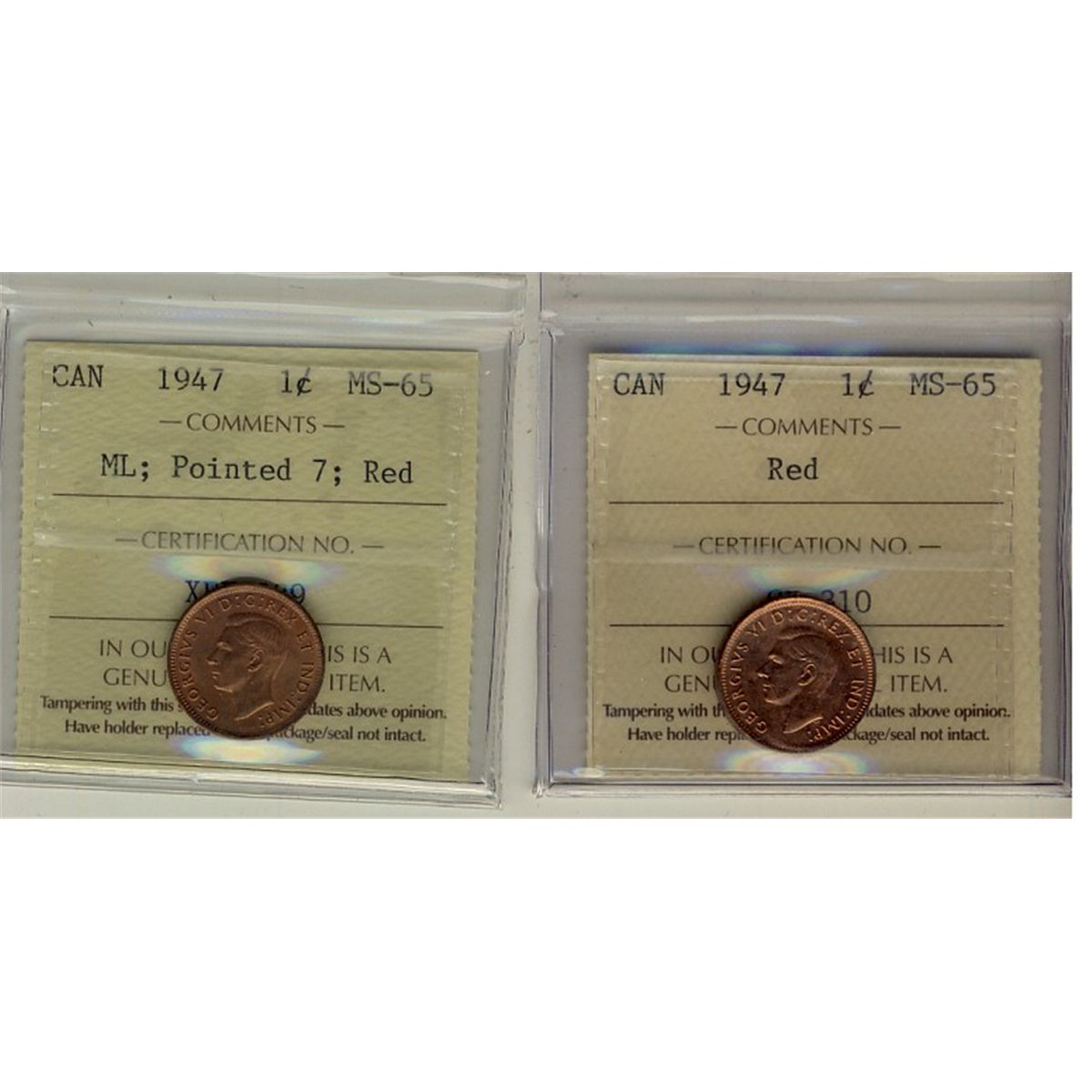 1947 & 1947 1¢ ML Ptd ICCS MS65RD. Lot of 2 coins.