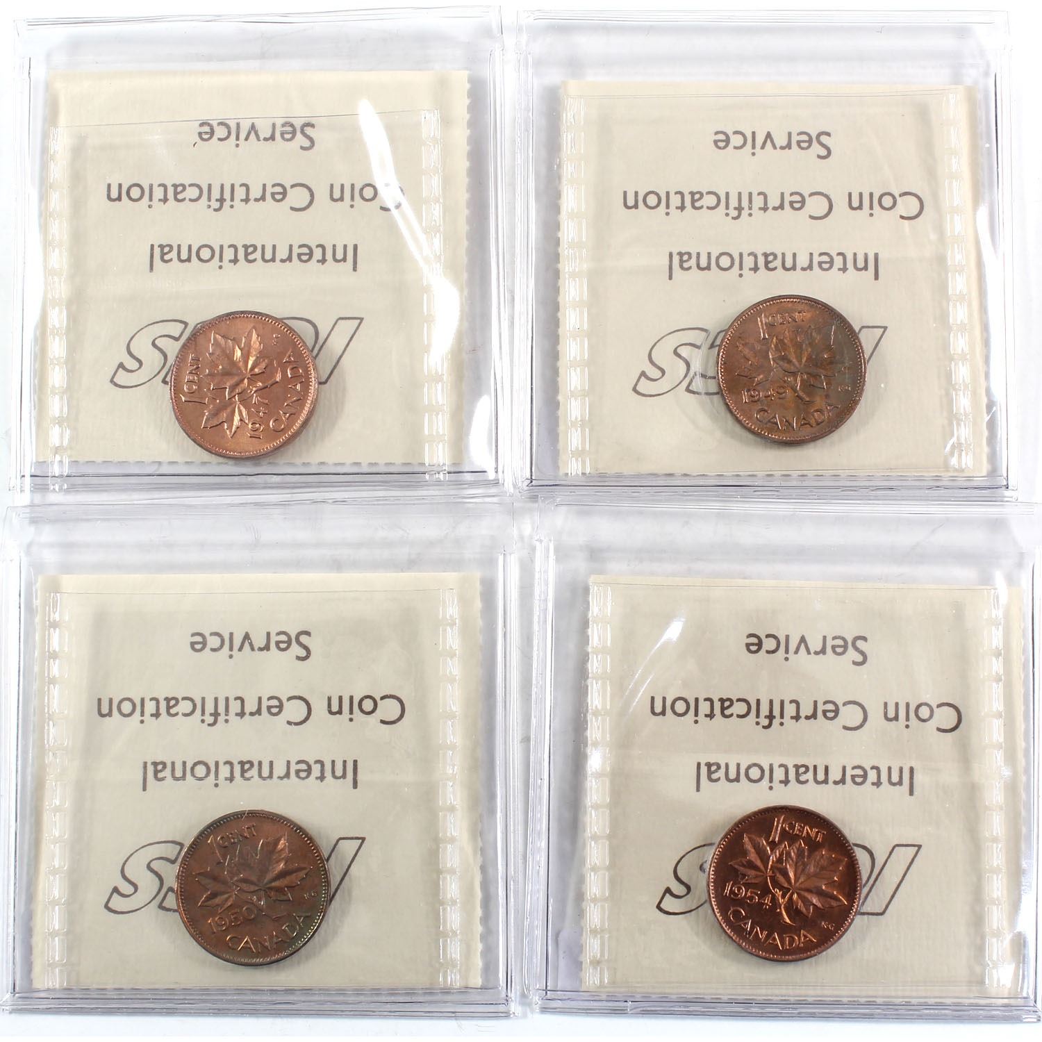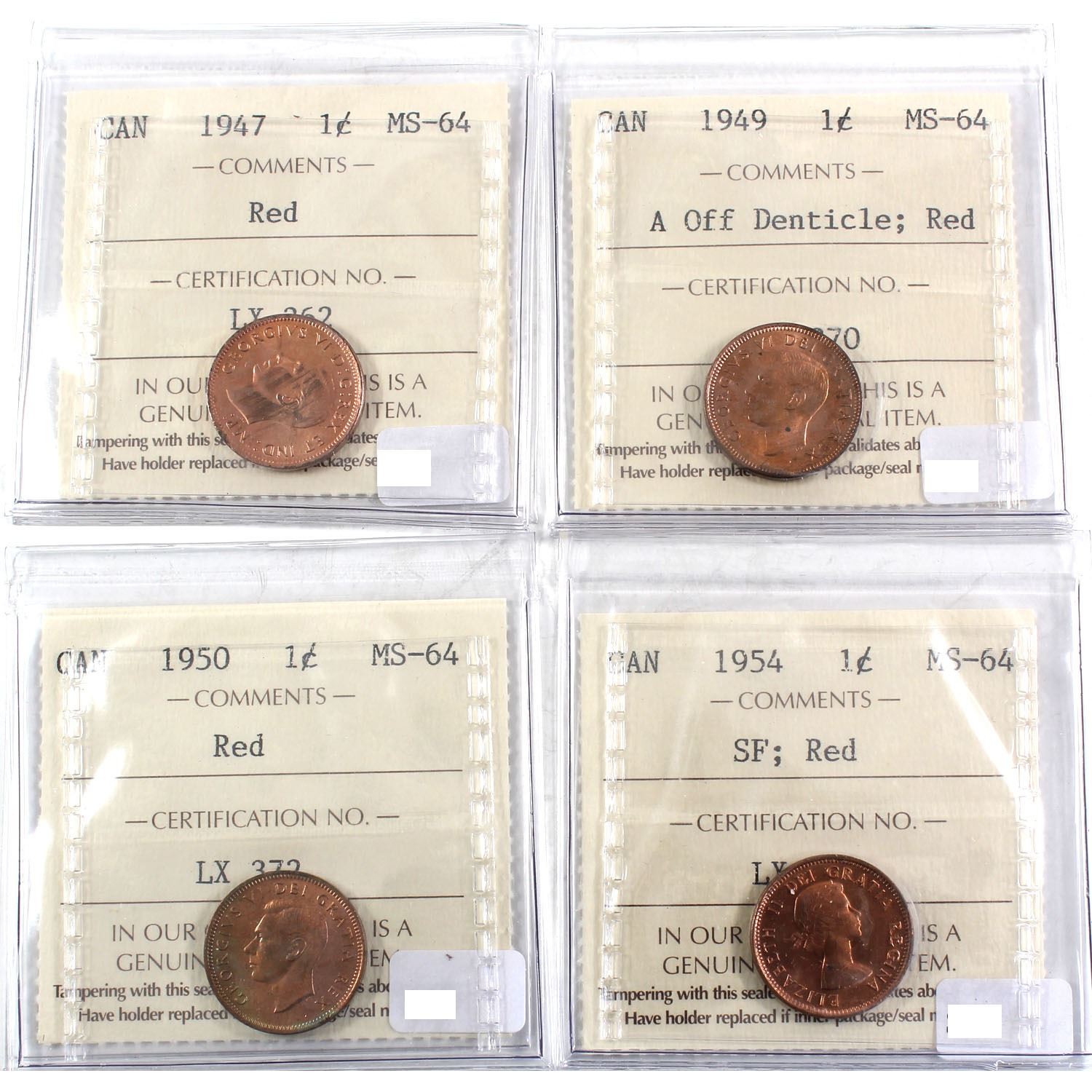 1947, 1949 A off Denticle, 1950 & 1954 SF Canada 1-cent ICCS Certified MS-64 Red. 4pcs