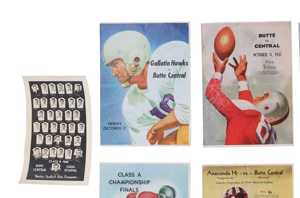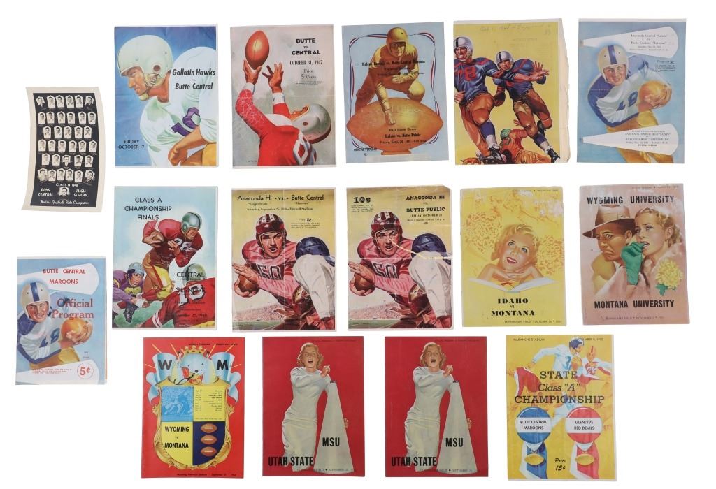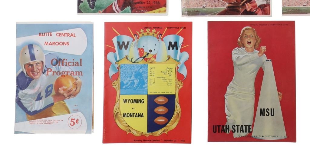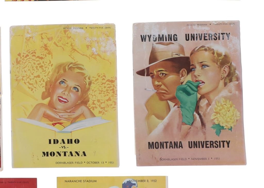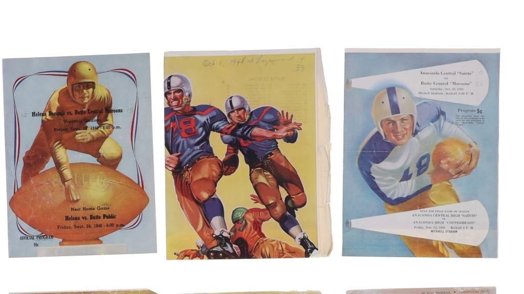 For your consideration is this collection of college and high school football programs from between 1948-1952. The programs feature rules of the games, ref signals, score cards, player rosters and advertisements for things such as: Coke-a-Cola, cigarettes, services and more. The programs featured in this lot are: State Class A Championship between Butte Central Maroons and Glendive Red Devils 1952, Class A Championship between Butte Central and Glendive 1948, Gallatin Hawks vs Butte Central, Butte vs Central 1947, Anaconda Central Saints vs Butte Central Maroons 1948, Helena Bengals vs Butte Central Maroons 1948, Anaconda High vs Butte Public, Anaconda High vs Butte Central 1948, Utah State vs MSU 1952 (2), Idaho vs Montana 1951, Butte Central Maroons vs Gallatin High 1949, Wyoming vs Montana 1952, Wyoming University vs Montana University 1951, Butte Central vs Gallatin High 1948, and lastly, a photo card of the Boys Central High School Championship Football team in 1948. All of the programs feature colored images. The programs show good condition with wear and slight fading from their vintage age, with one showing a torn front page. The programs are all in good, readable condition and come in plastic slips to preserve their condition. The largest measures 11" L x 8 5/8" W while the smallest measures 9 3/4" L x 6 7/8" W. The photo card measures 9 5/8" L x 5 7/8" W.